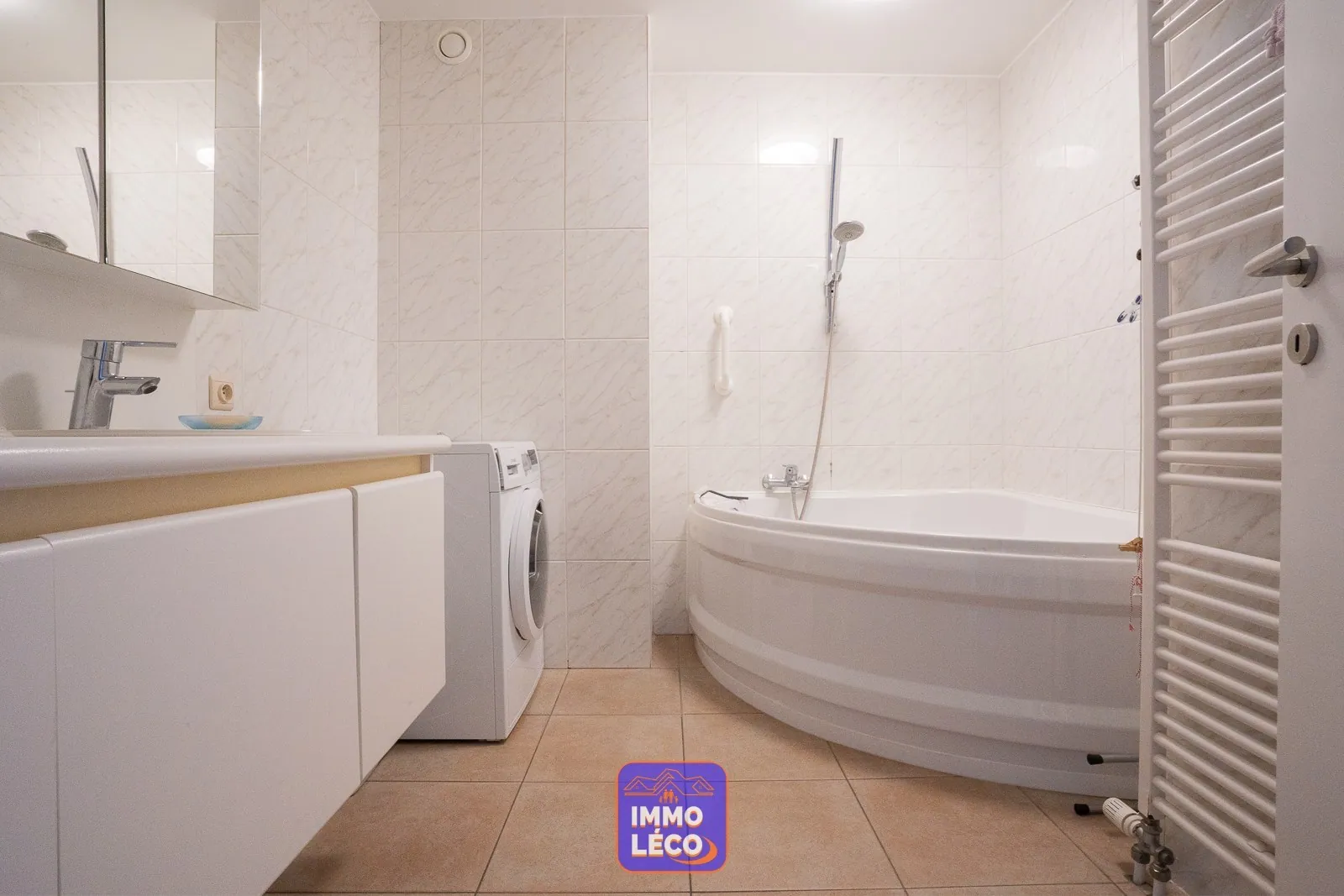 d'une baignoire, d'un meuble double vasque, d'un coin laverie et d'un sèche serviette, buanderie et WC séparé.