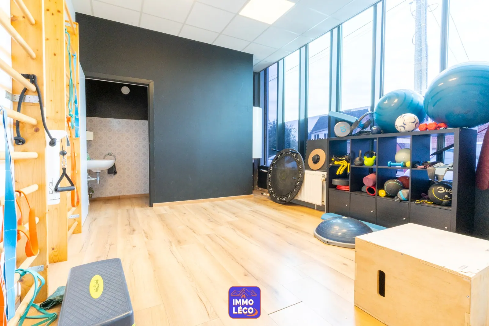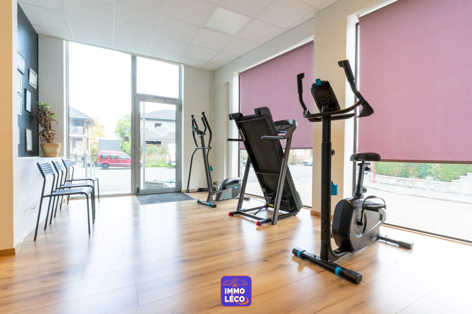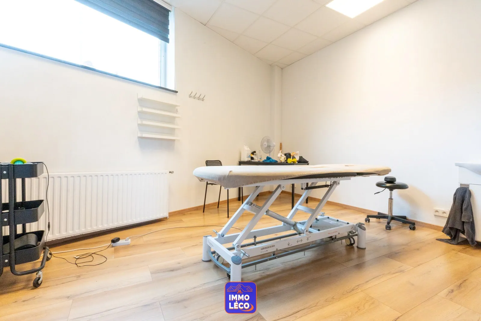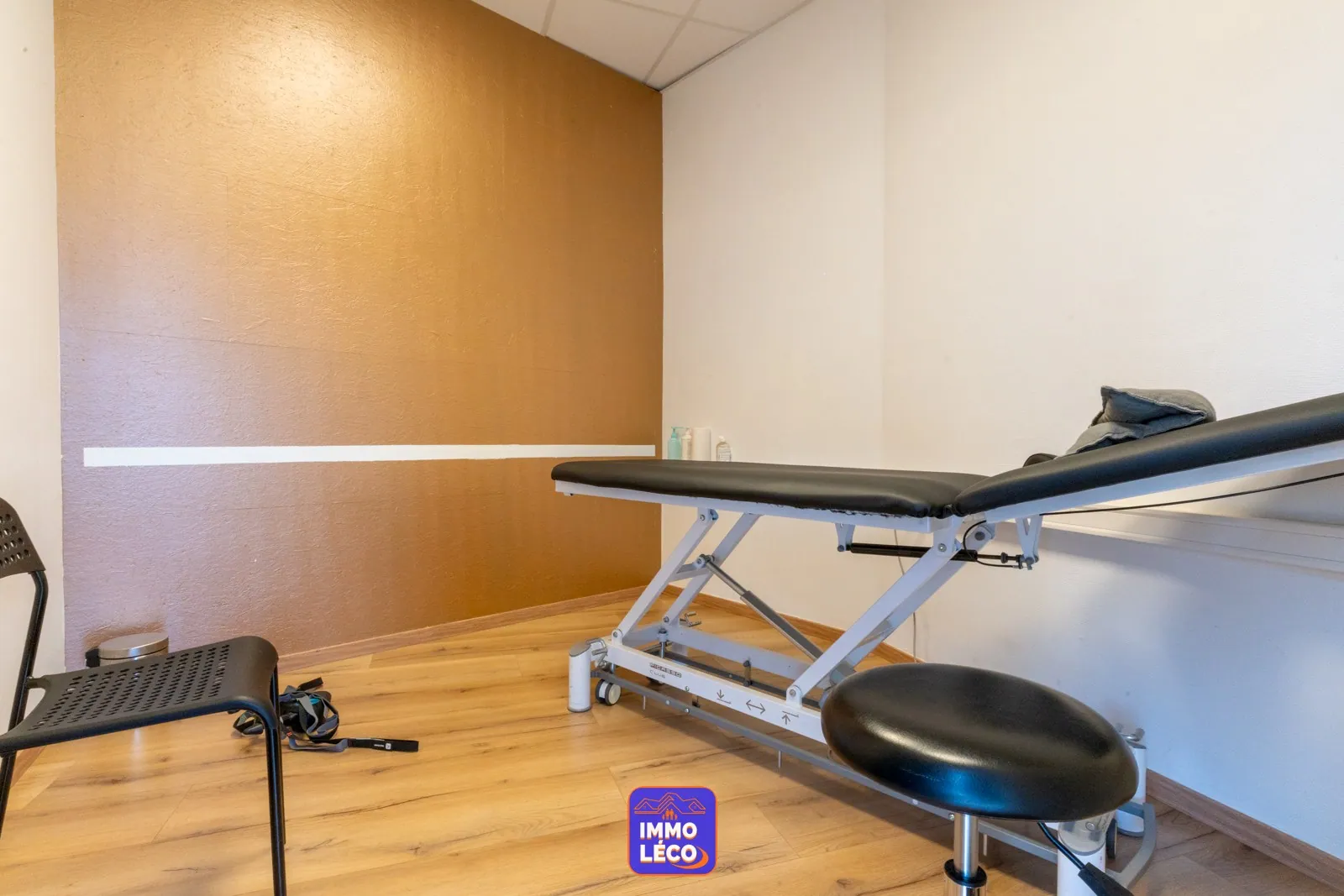 avec comptoir et salle d’attente confortable, espace ouvert (actuellement avec matériel de rééducation sportive), modulable selon vos besoins, deux pièces indépendantes idéales pour bureaux, cabinets ou salles de soins, toilettes clientèle, parking privé pour la clientèle.