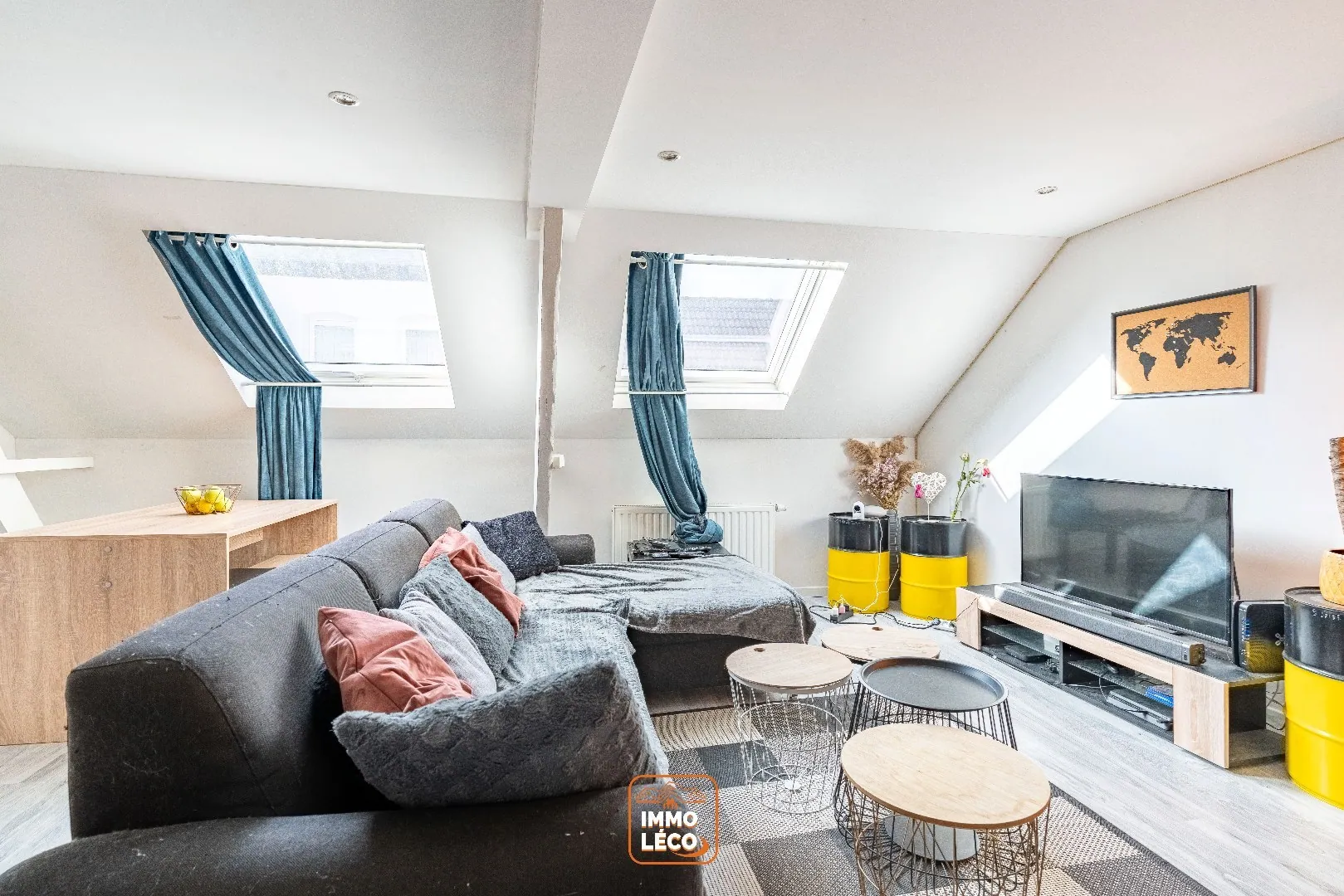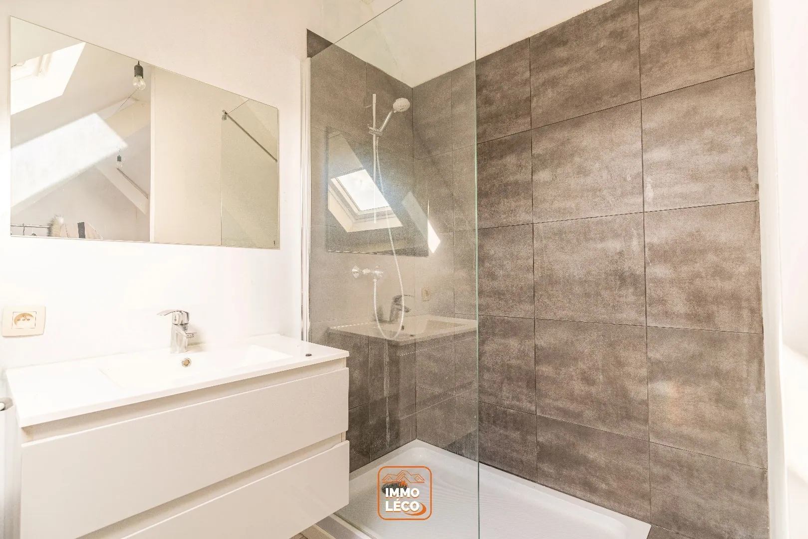 Grand espace de vie desservant un lumineux séjour avec escalier bois apparent (salon , salle à manger), cuisine équipée ouverte (hotte, plaque de cuisson électrique, four, frigo, double évier, nombreux rangements, coin repas), salle de bains composée d’une douche à l’italienne, d’un meuble lavabo et d’un sèche