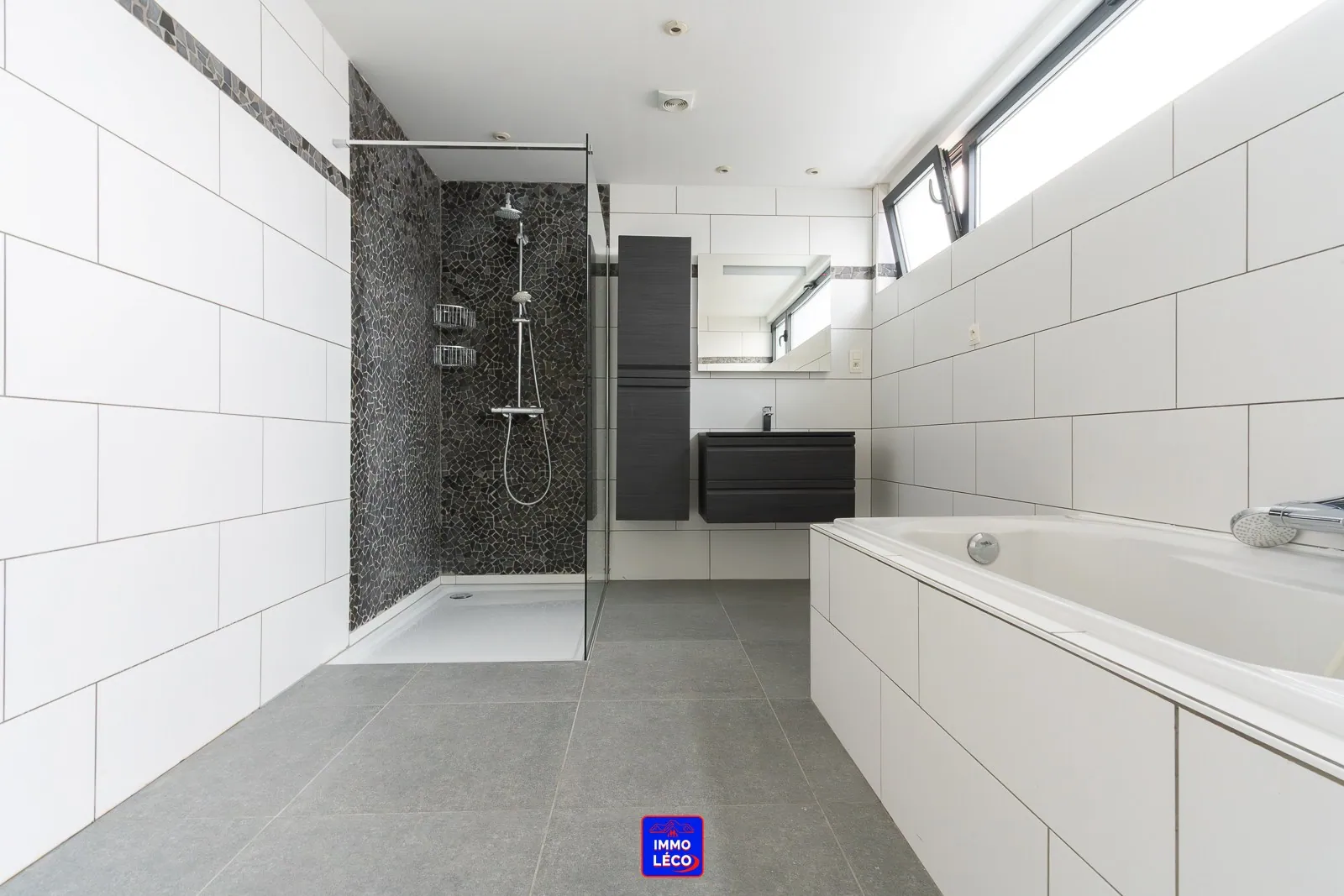 de bains composée d'une douche à l'italienne, d'une baignoire, d'un meuble lavabo et d'un sèche serviette.