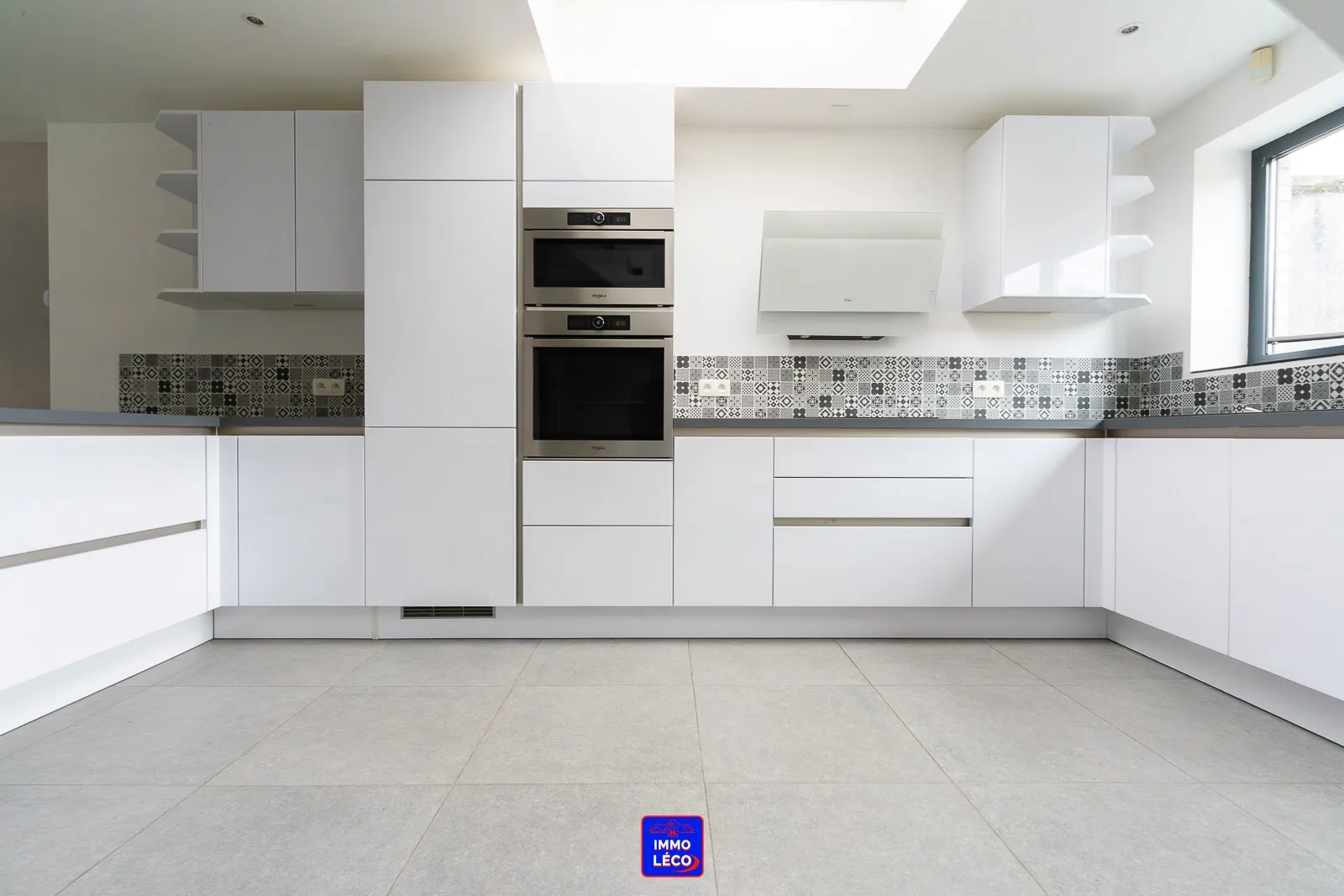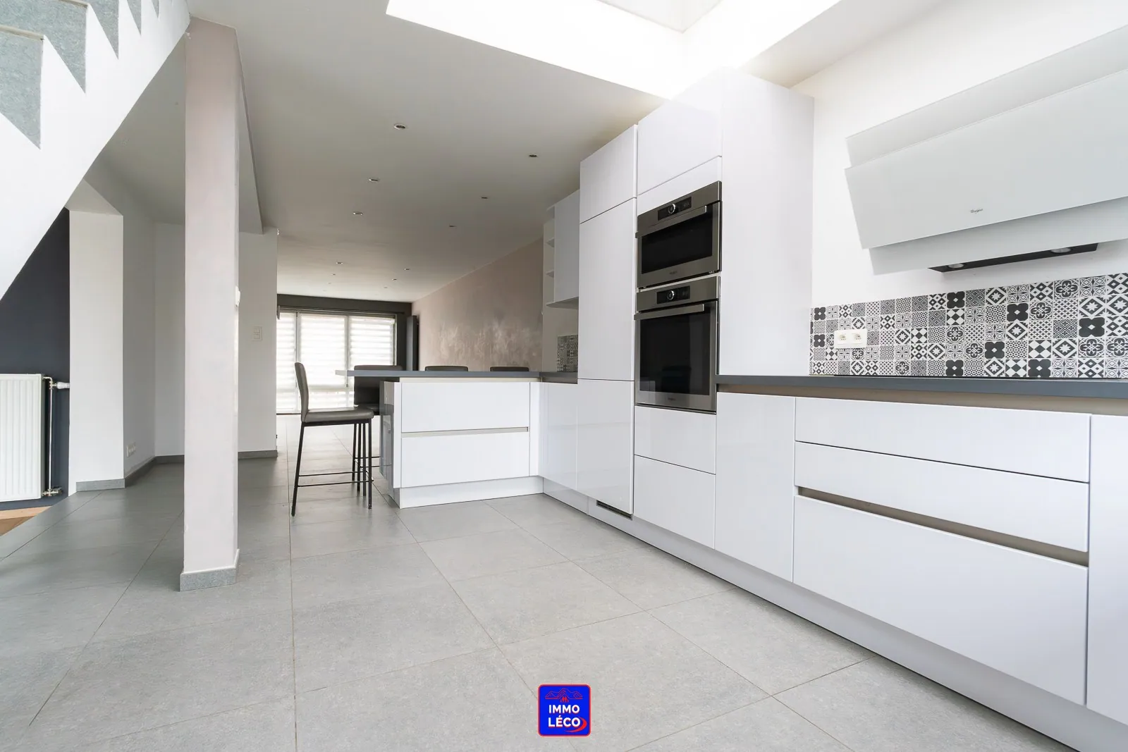 Au rez-de-chaussée : Hall d'entrée, WC, spacieux et lumineux séjour en deux parties (salon, salle à manger), cuisine full équipée ouverte avec coin repas (hotte, plaque de cuisson, four, micro-ondes, lave-vaisselle, évier, nombreux rangements intégrés).