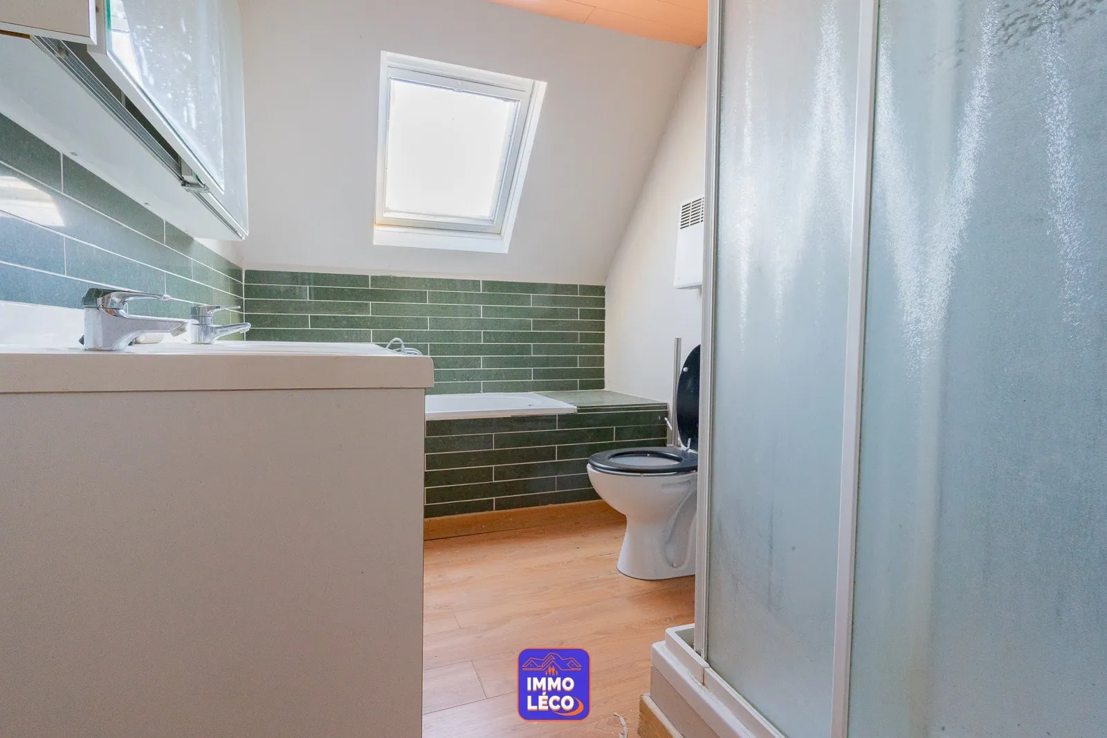 Une salle de bains composée d'une baignoire, d'une douche, d'un meuble lavabo et d'un WC.