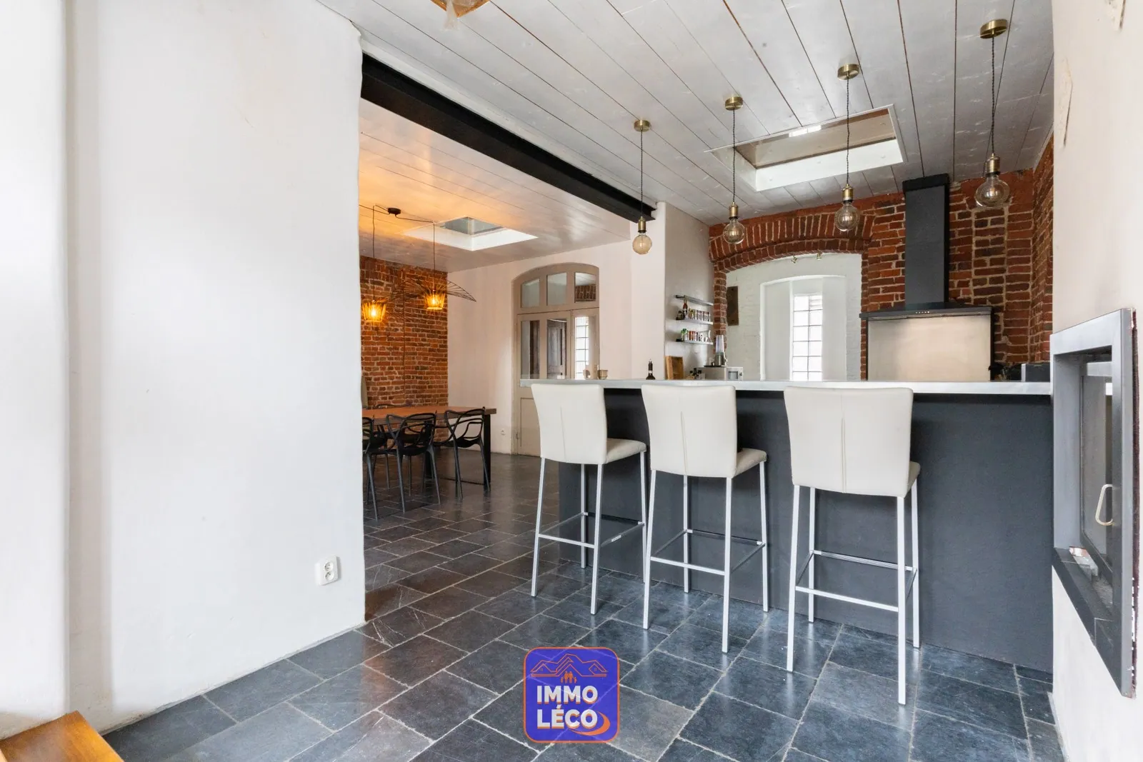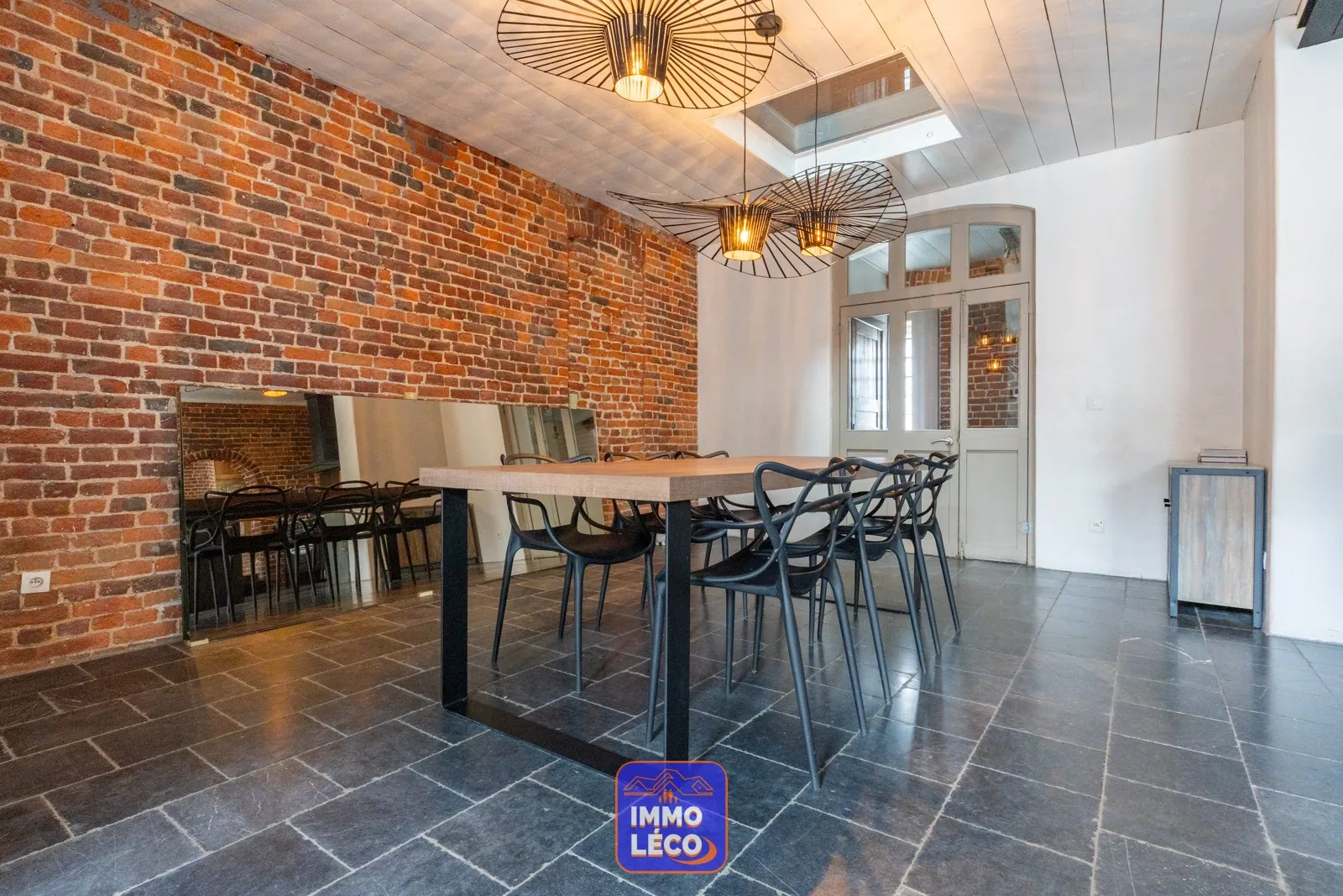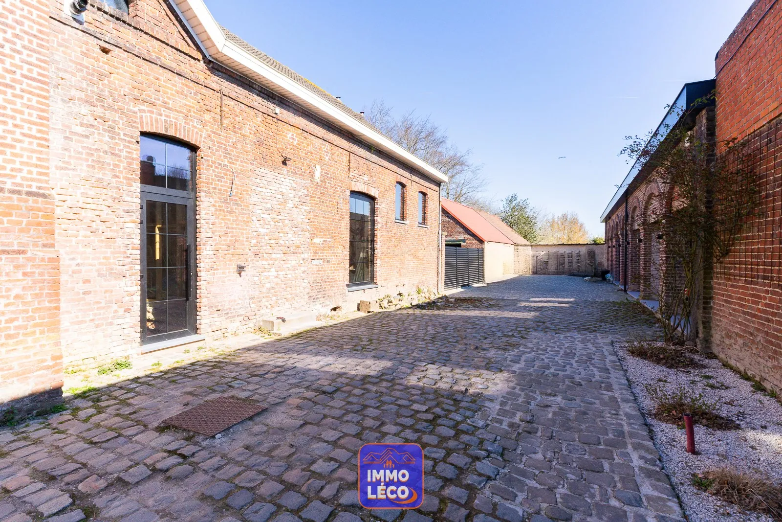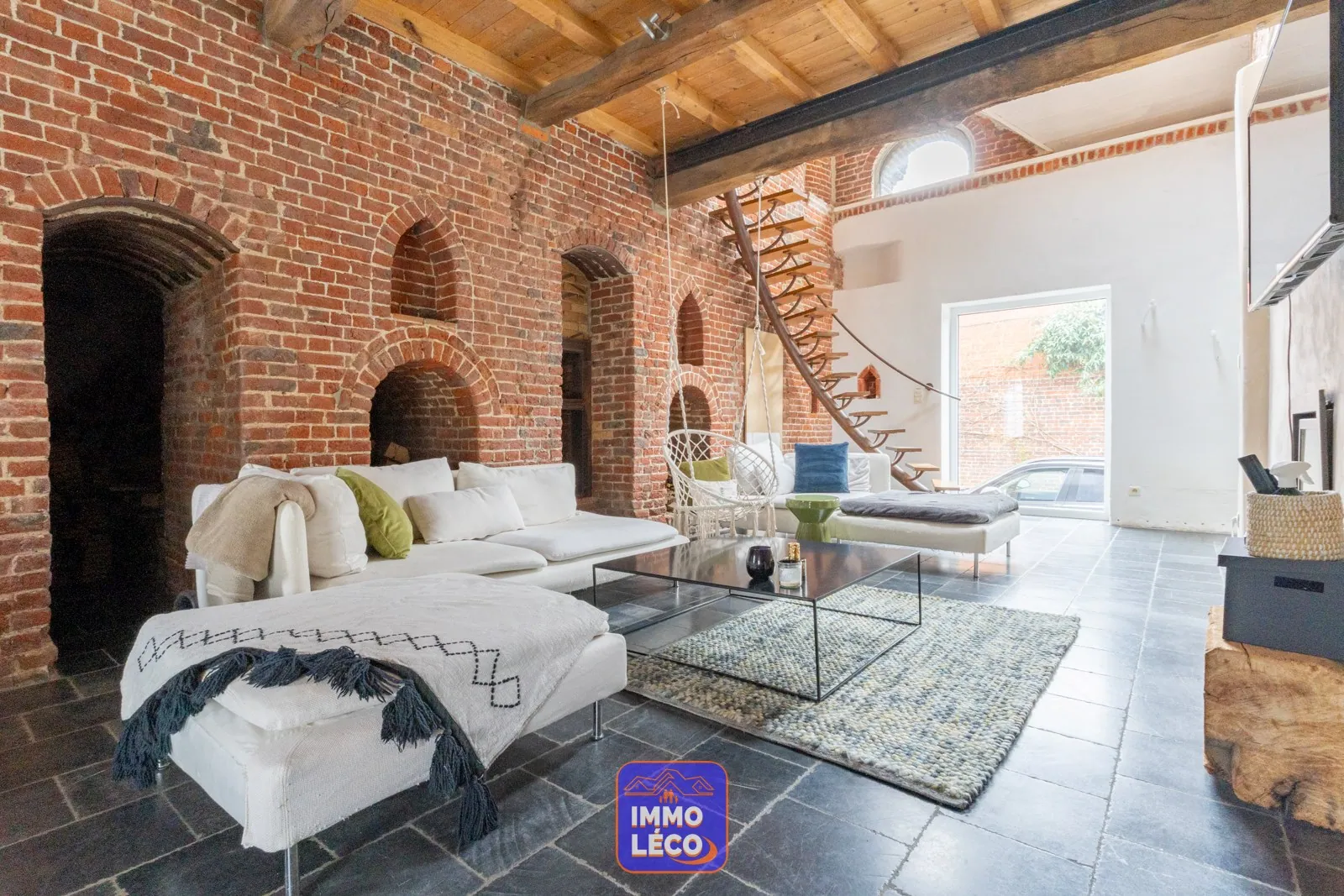 2) Habitation rénovée dans un style LOFT avec une surface habitable de 280m², composée d'un hall d'entrée, d'une grande salle à manger, d'une cuisine full équipée ouverte avec coin repas, d'un bel espace salon avec escalier apparent. A l'étage, vaste hall de nuit, bureau, trois chambres avec mezzanine, salle de bains. Estimation du revenu locatif : +/- 1500€/mois (actuellement loué en colocation).