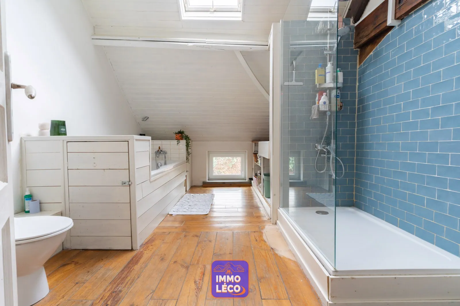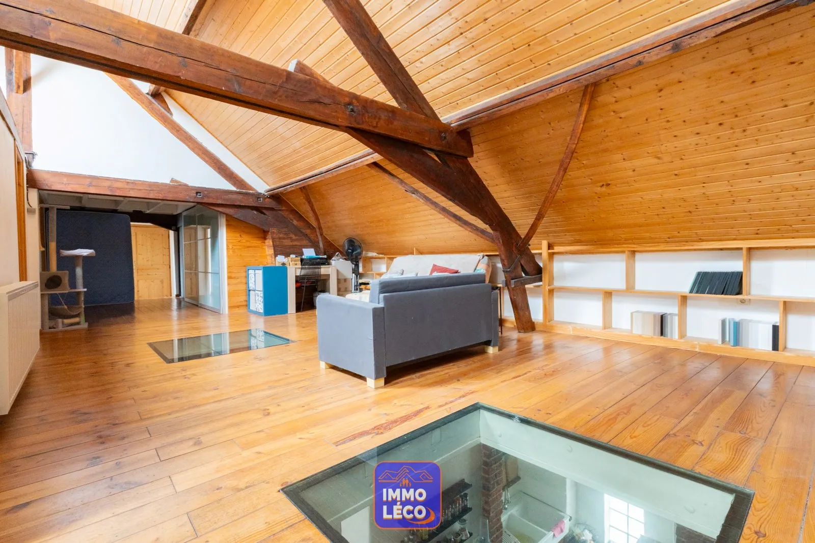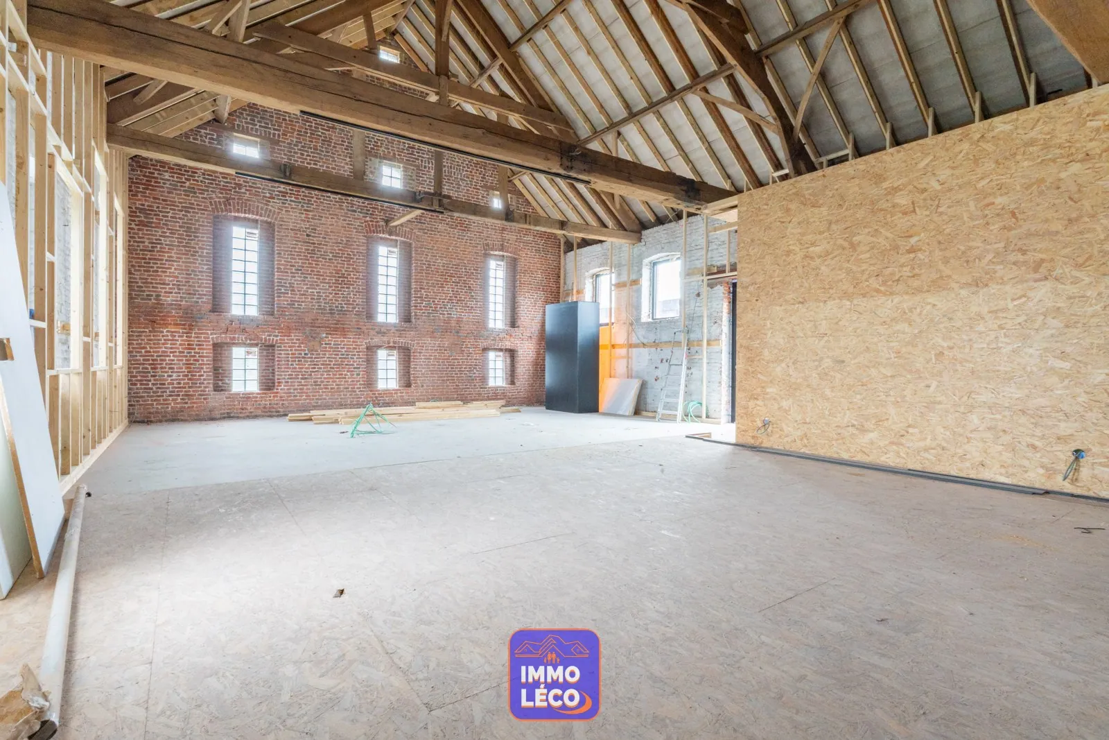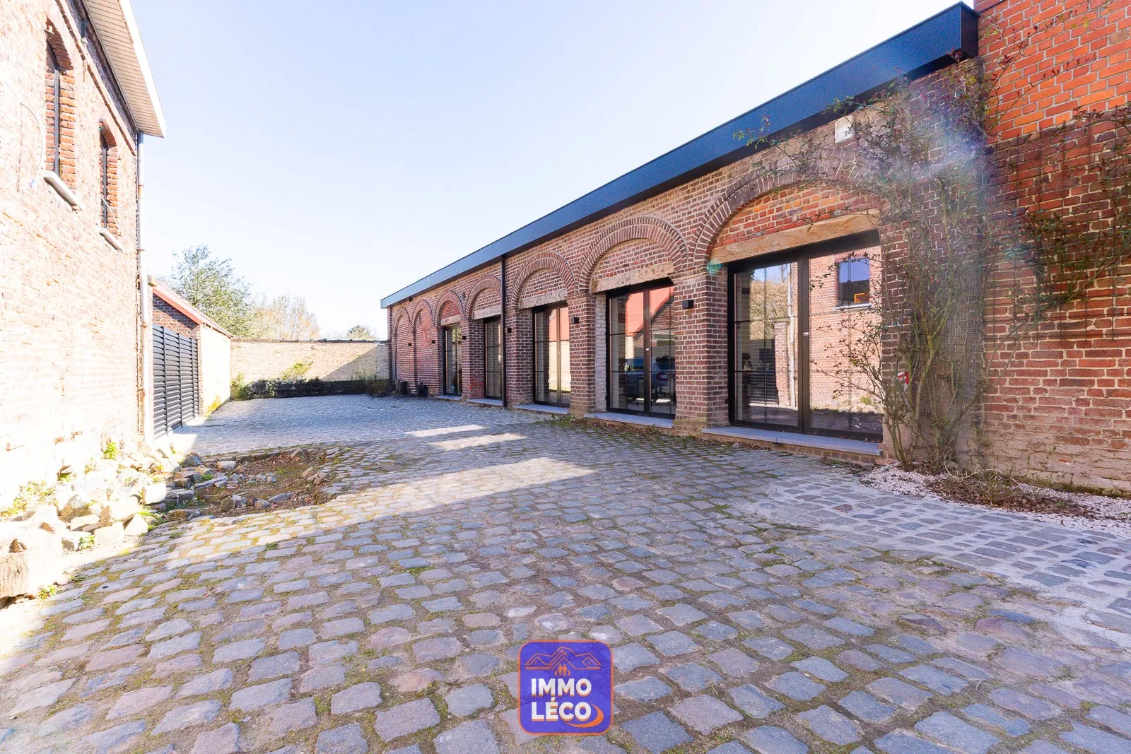 2) Habitation rénovée dans un style LOFT avec une surface habitable de 280m², composée d'un hall d'entrée, d'une grande salle à manger, d'une cuisine full équipée ouverte avec coin repas, d'un bel espace salon avec escalier apparent. A l'étage, vaste hall de nuit, bureau, trois chambres avec mezzanine, salle de bains. Estimation du revenu locatif : +/- 1500€/mois (actuellement loué en colocation).