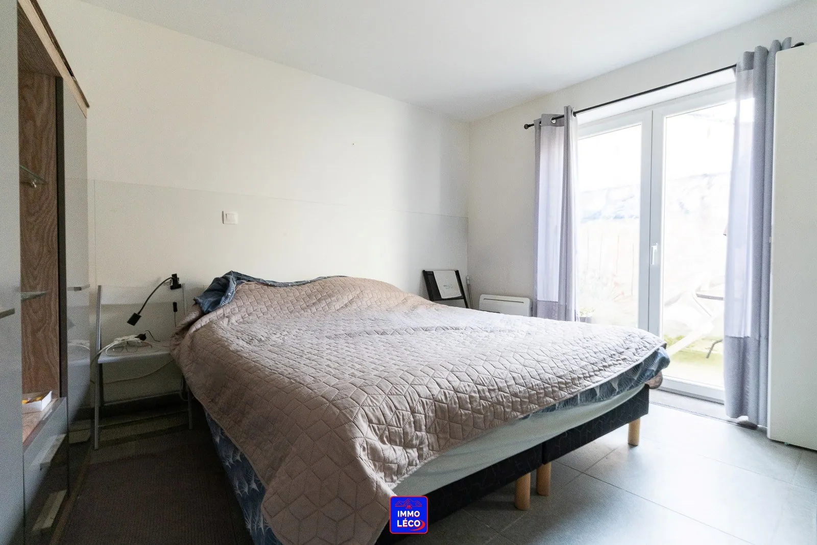 belle et grande chambre, salle de bains faïencée (douche, meuble lavabo), WC, accès à une cour.