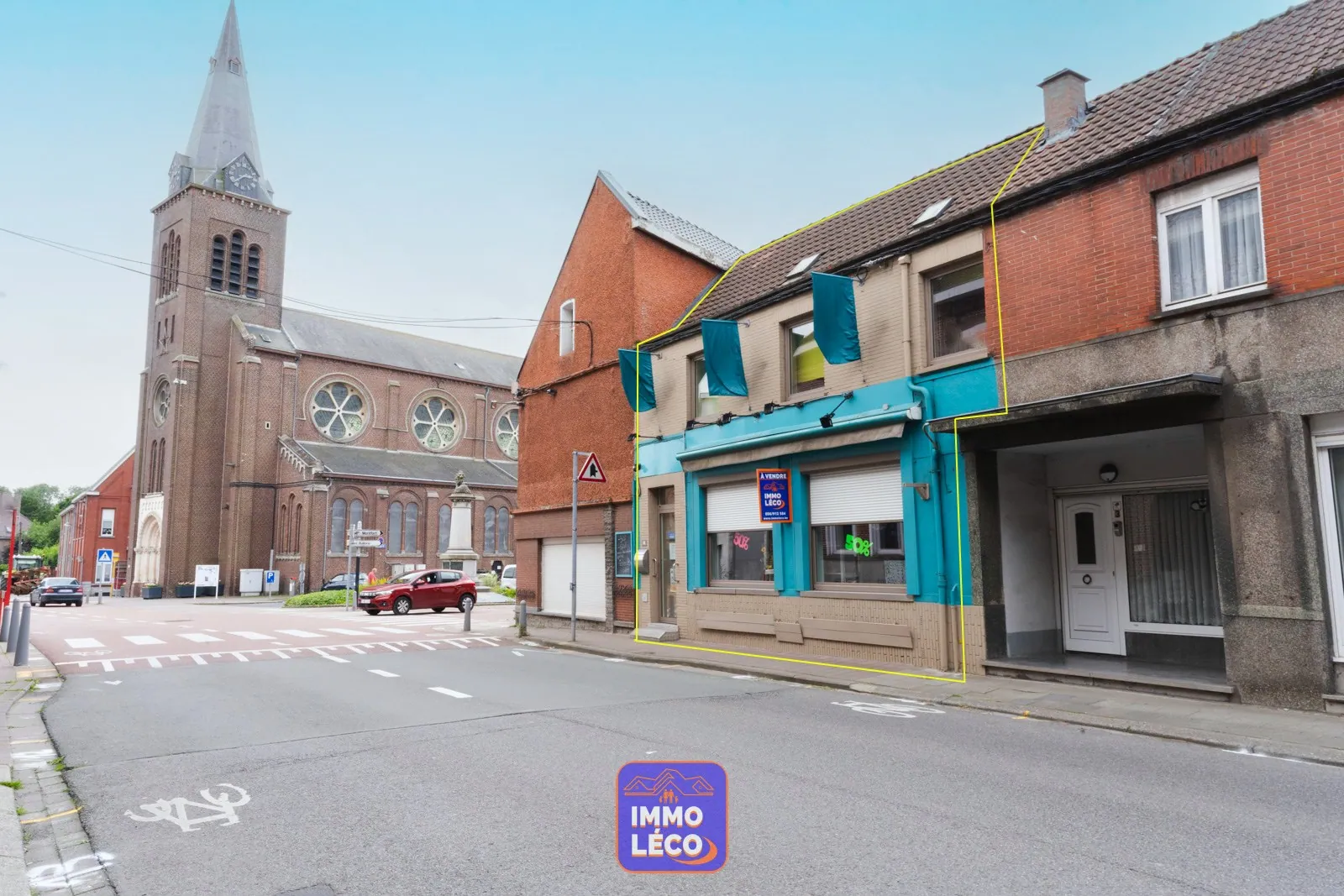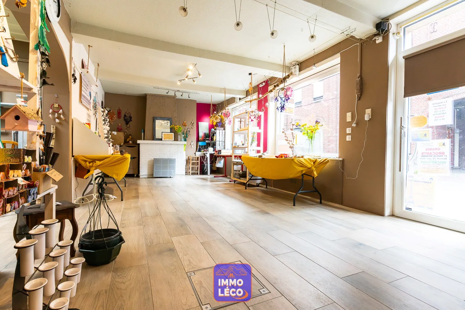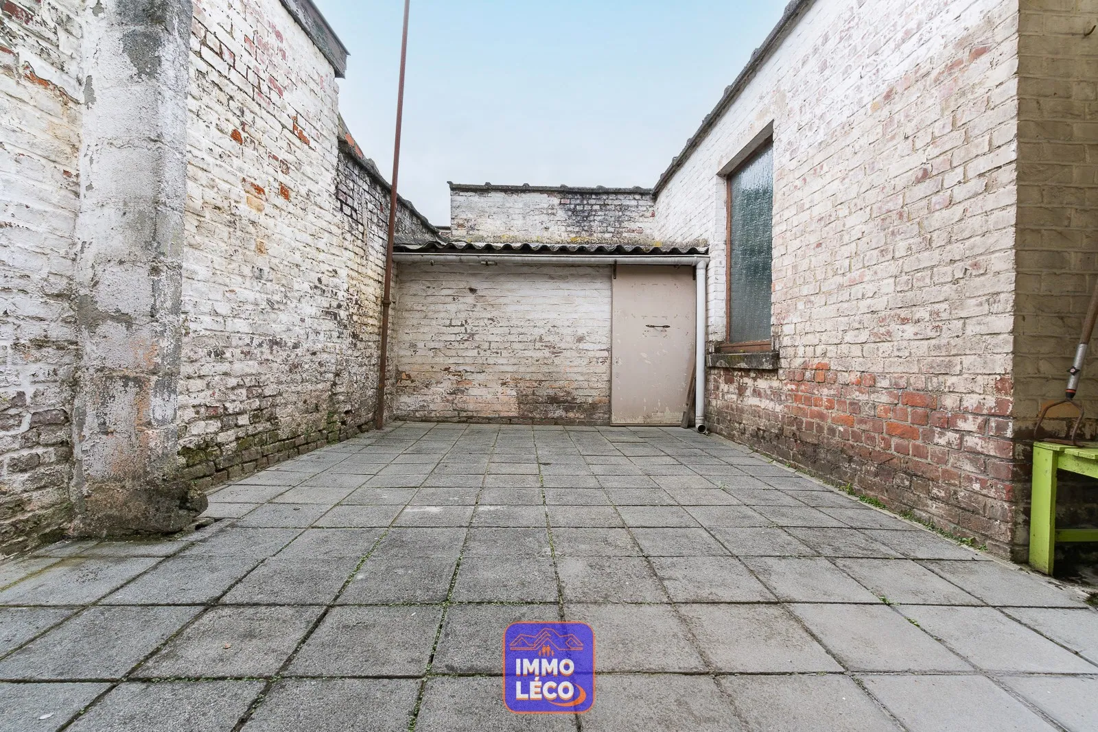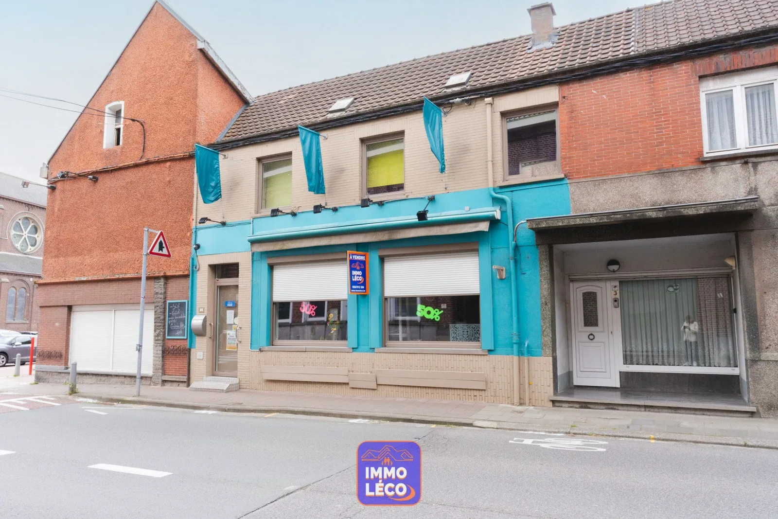commerciale carrelée en façade de +/- 45m² avec 2 larges vitrines, un coin d'eau séparé et une cave. A l'arrière, remise/atelier, pièce de stockage, buanderie, WC, accès à une cour/terrasse avec seconde remise.