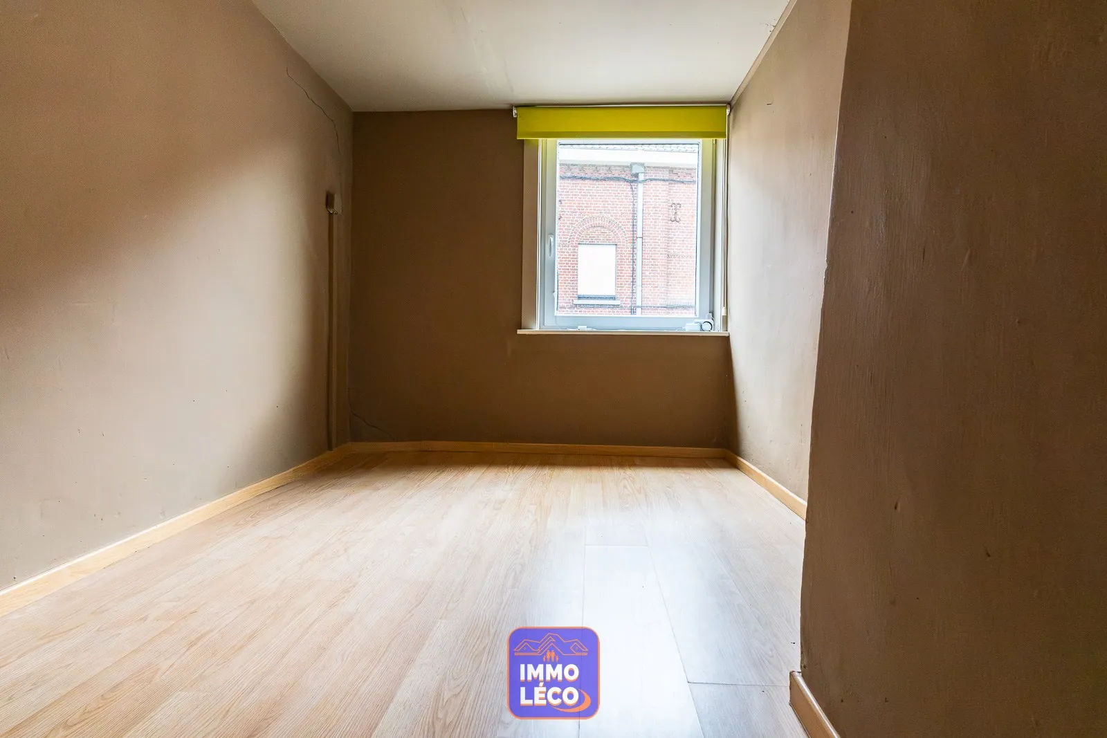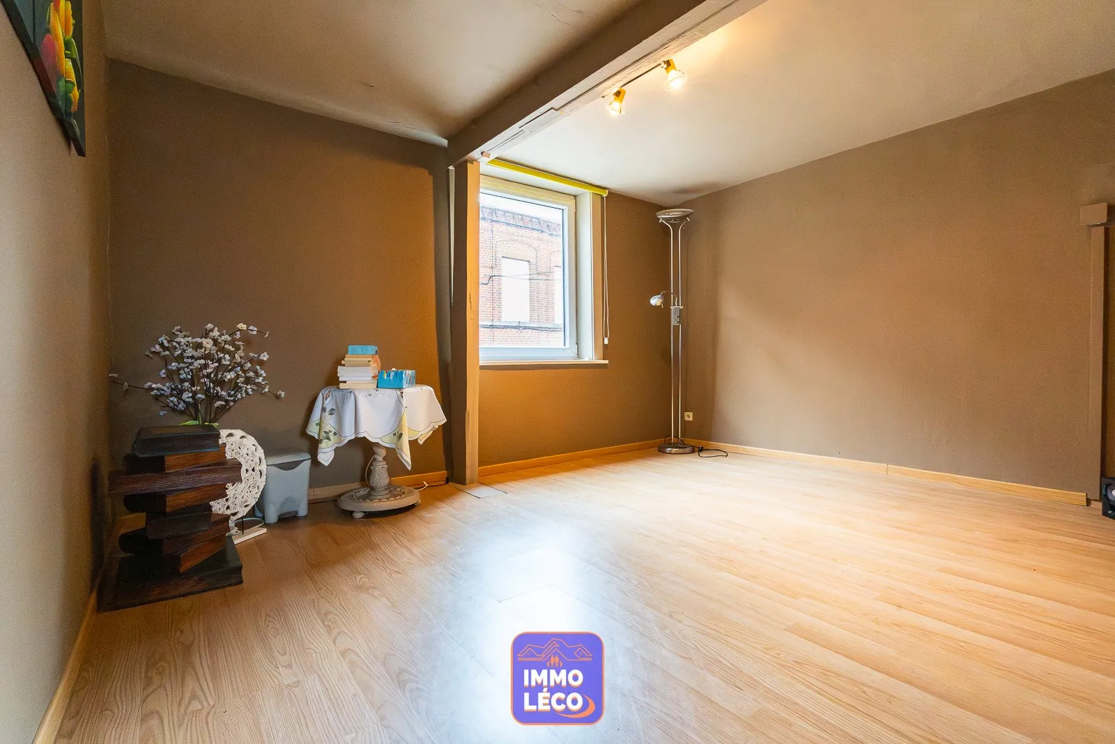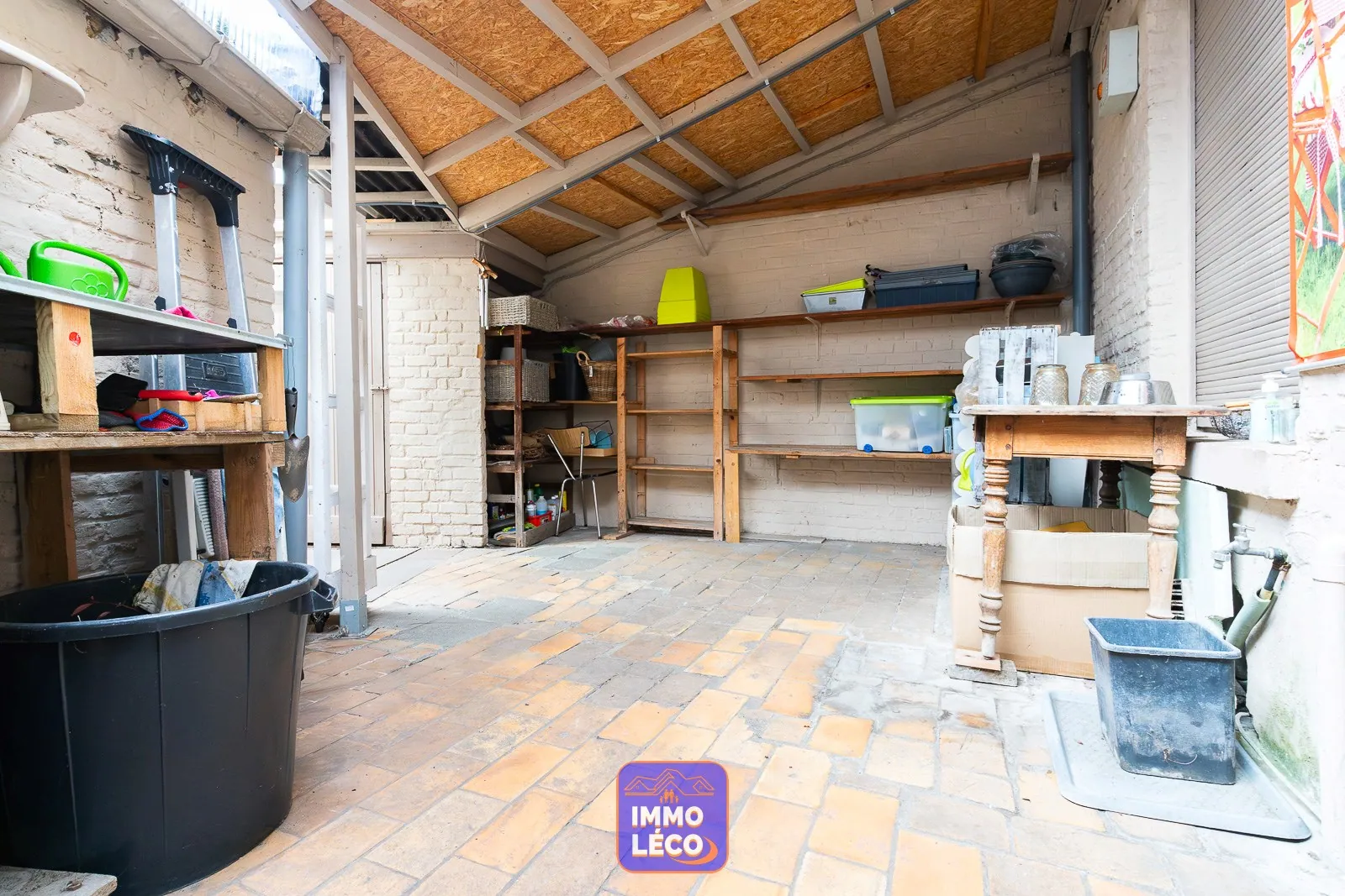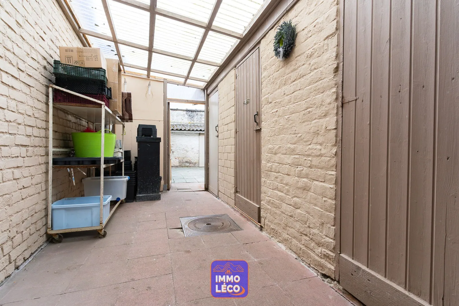 commerciale carrelée en façade de +/- 45m² avec 2 larges vitrines, un coin d'eau séparé et une cave. A l'arrière, remise/atelier, pièce de stockage, buanderie, WC, accès à une cour/terrasse avec seconde remise.