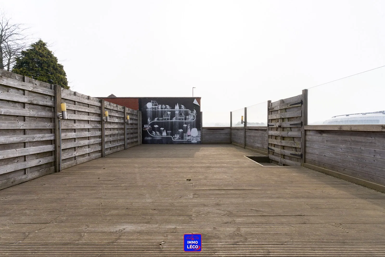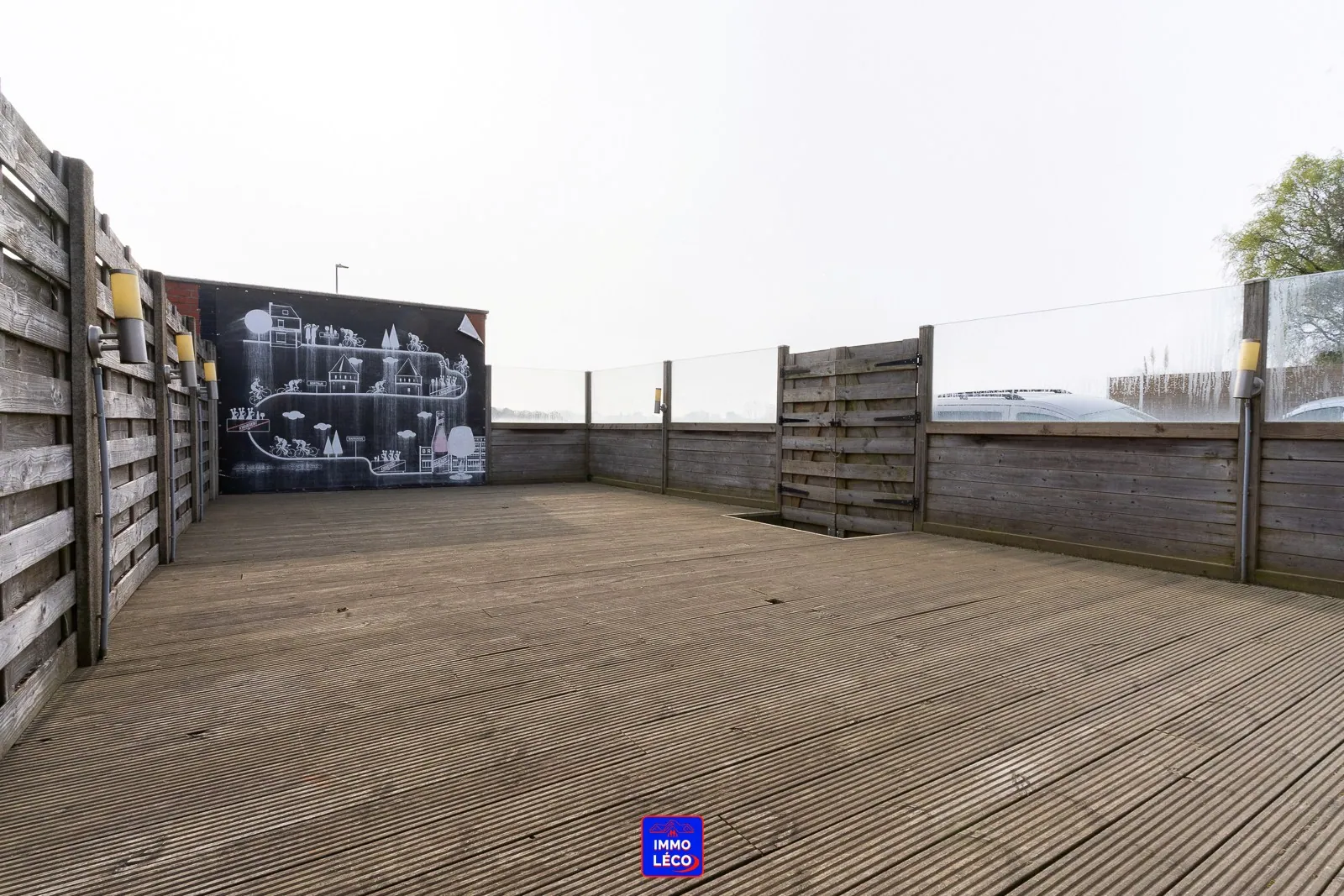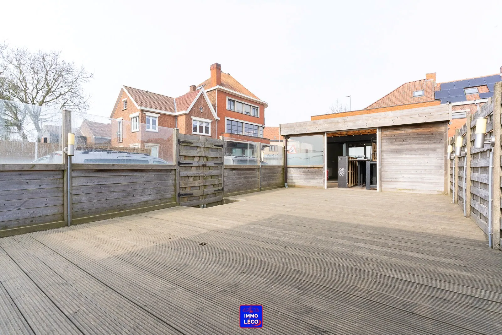 Extérieur : Véranda, terrasse en bois de +/- 50m², garage pour une voiture.