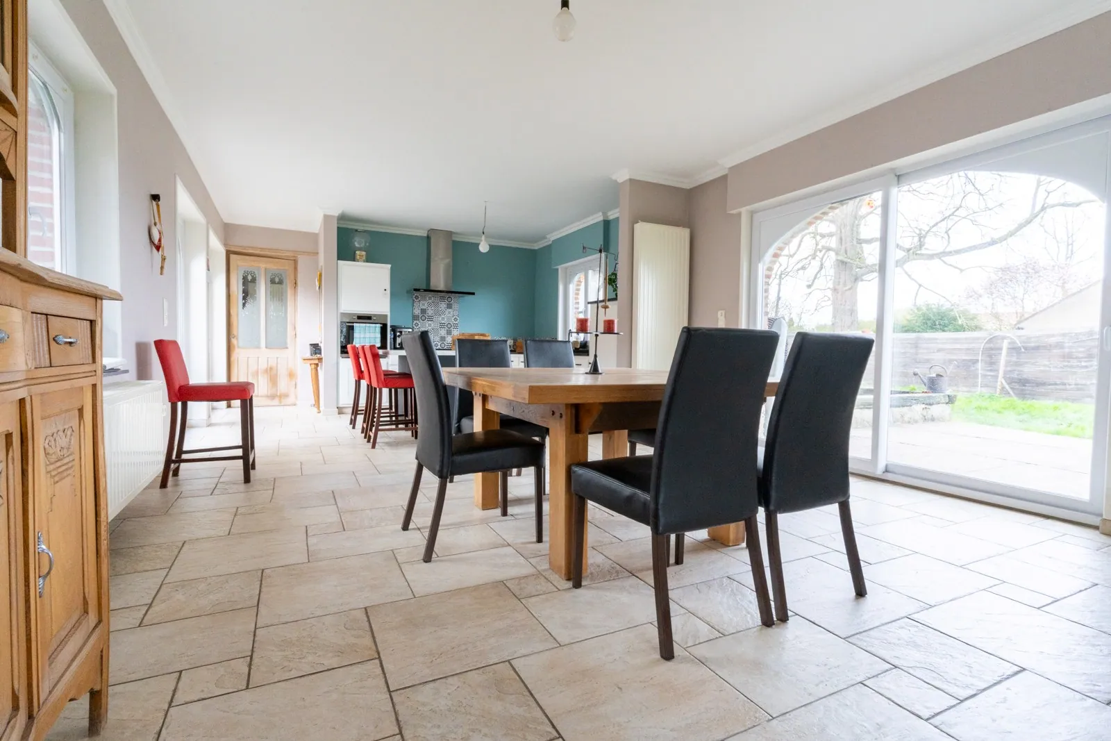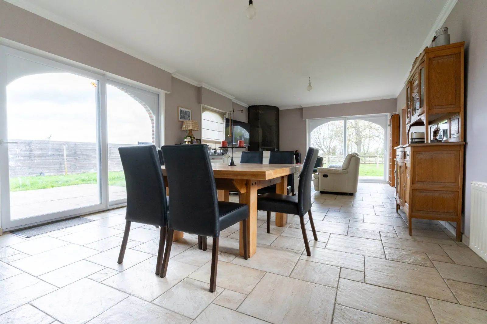 - Première annexe du corps de ferme : Grande habitation familiale desservant un hall d'entrée avec escalier apparent, un WC, un vaste et lumineux séjour de +/- 60m² (salon avec feu à bois, salle à manger), une cuisine équipée ouverte, un second coin repas séparé, une buanderie. A l'étage, un grand hall de nuit, trois à