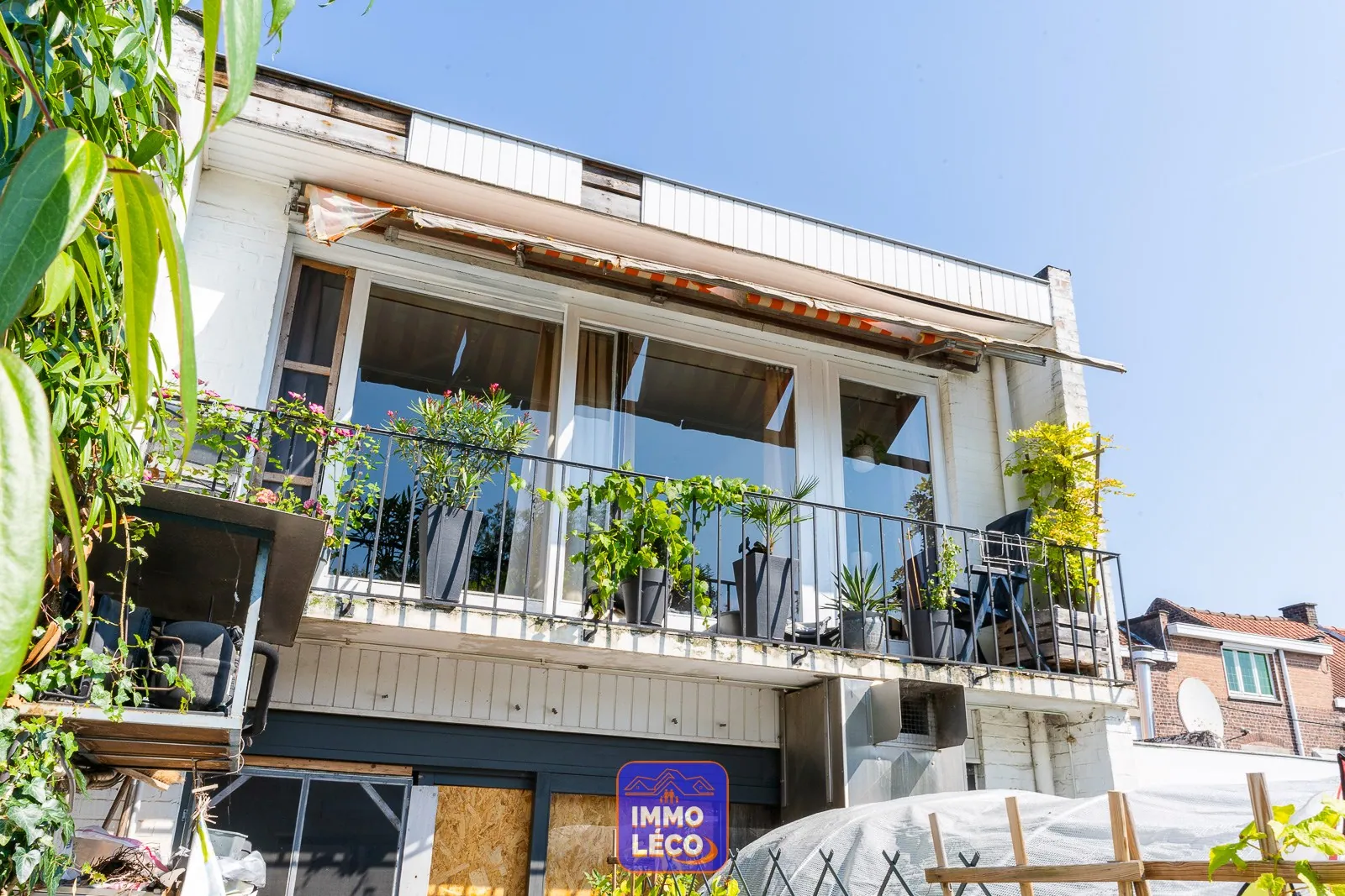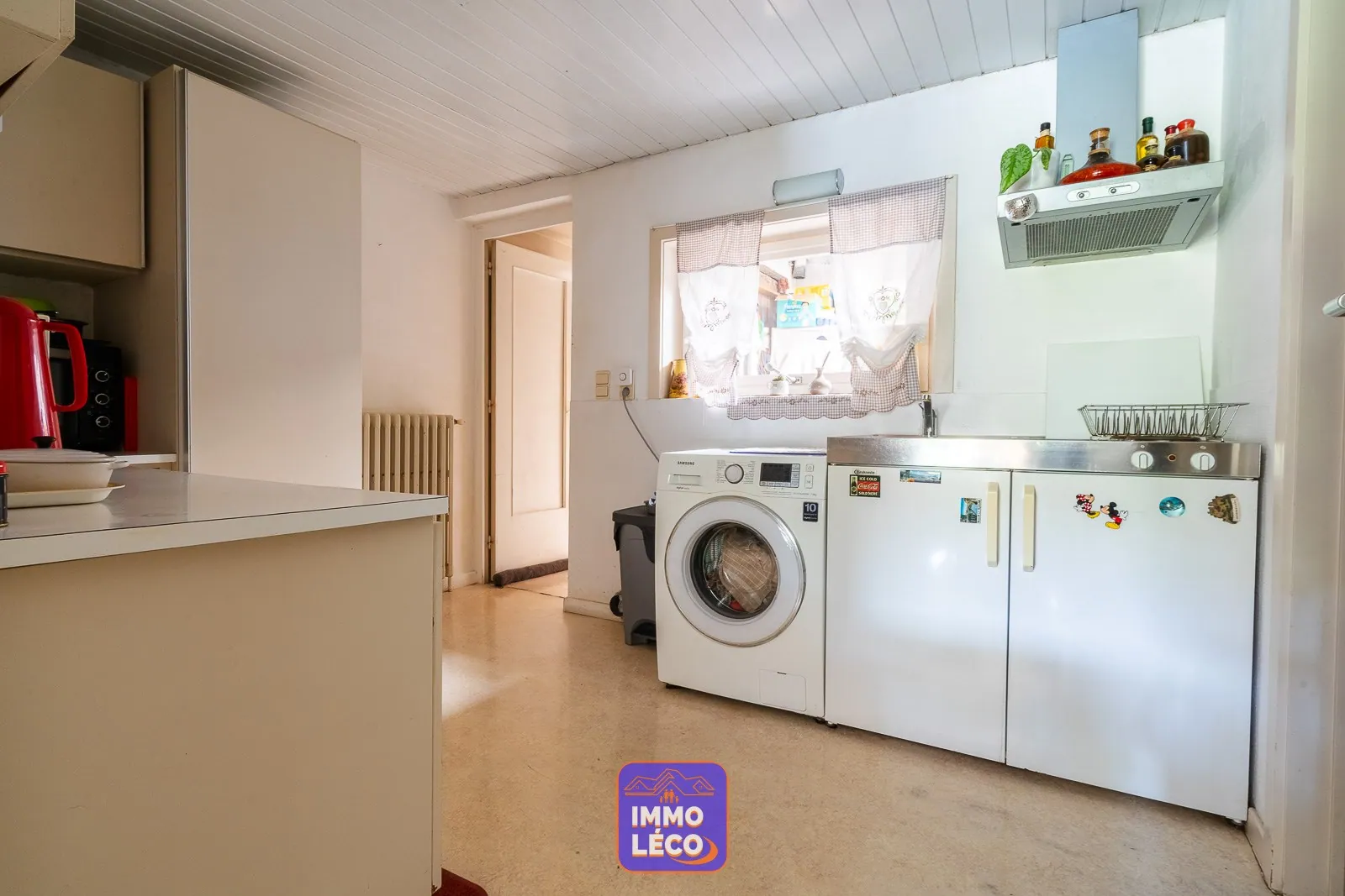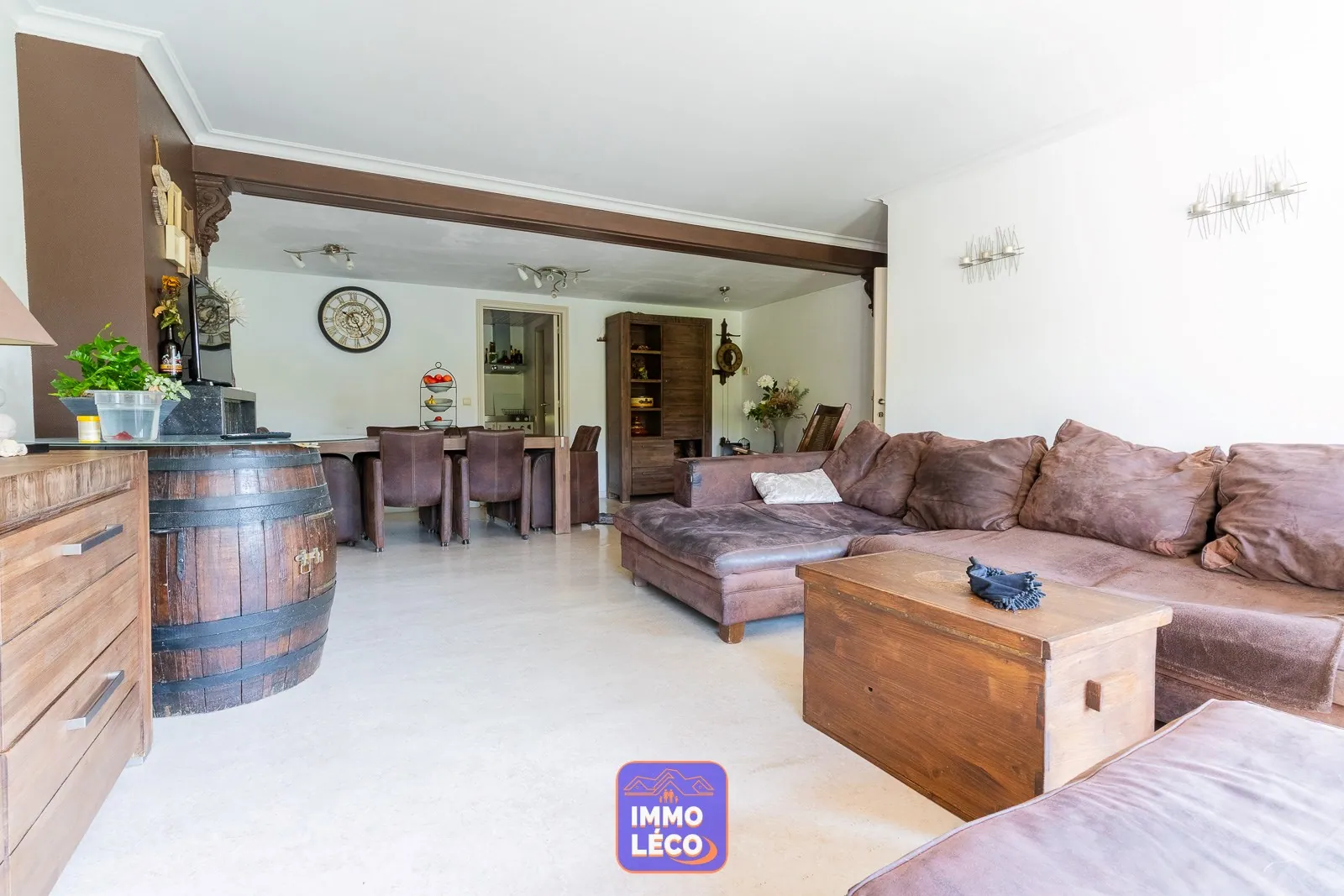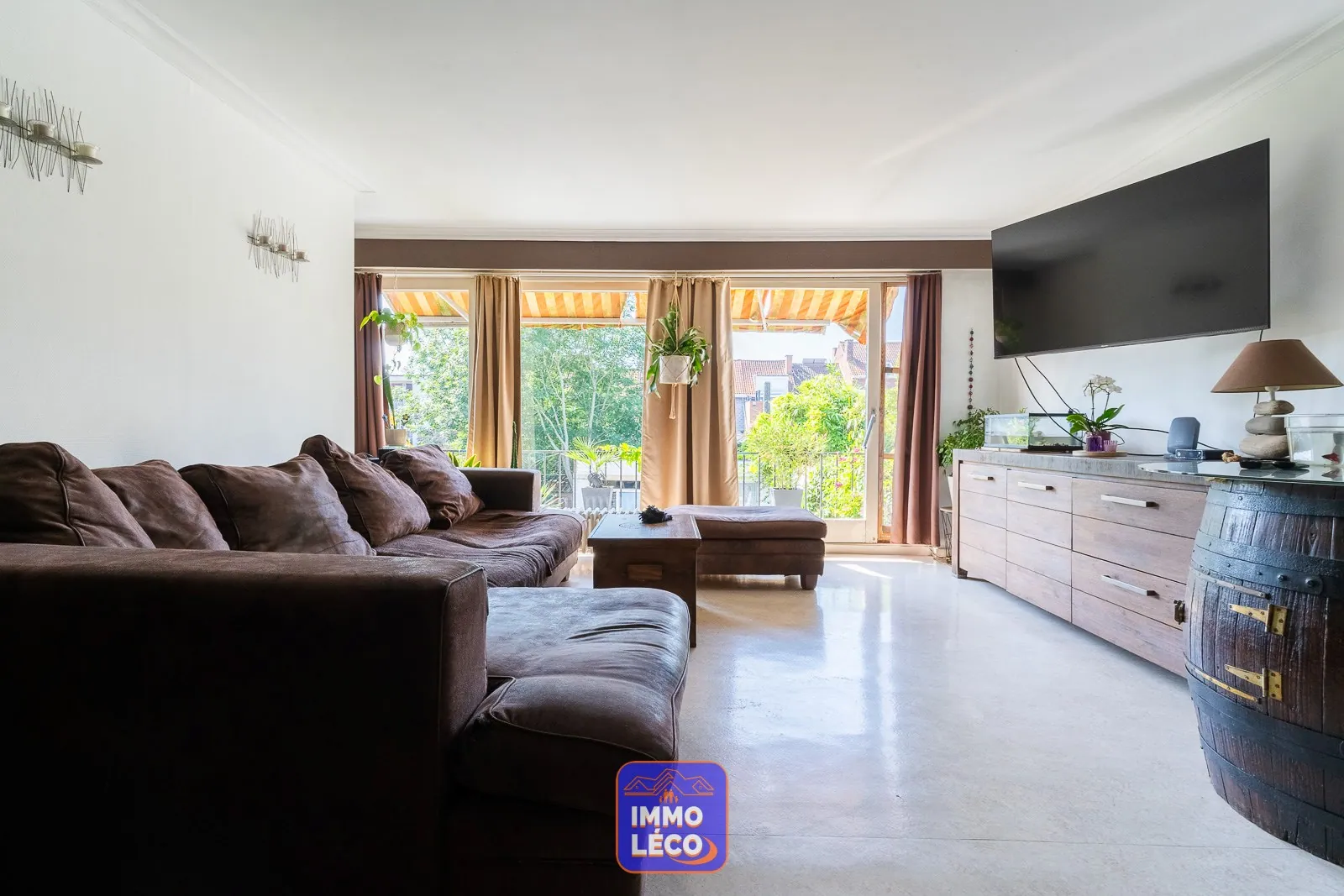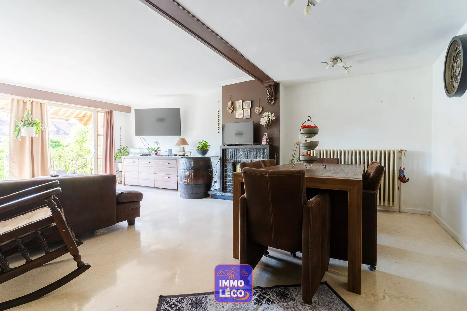 A l'étage, partie privative, lumineux séjour (salon, salle à manger), balcon, cuisine attenante semi équipée, salle de bains, deux chambres.