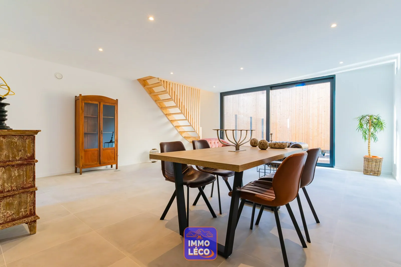 Au rez-de-chaussée : Hall d'entrée, WC, lumineux séjour avec escalier apparent (salon, salle à manger), cuisine full équipée ouverte de marque "Ixina", buanderie. Accès à un patio (de 38m² à 55m²).