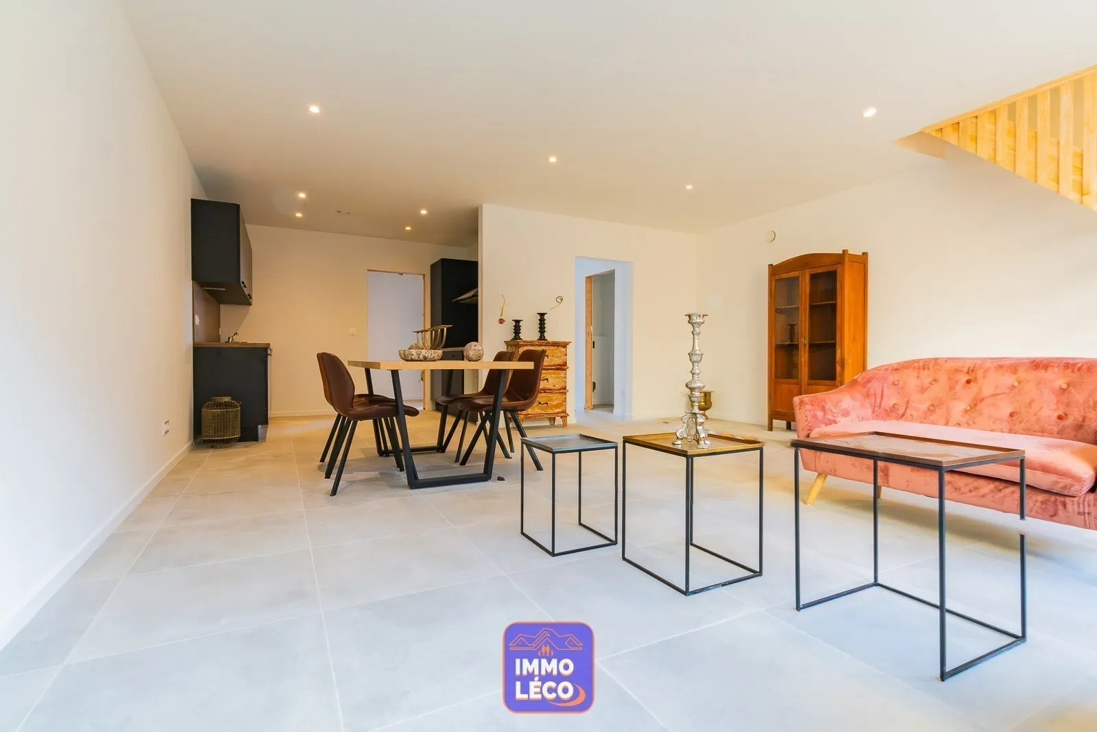 Au rez-de-chaussée : Hall d'entrée, WC, lumineux séjour avec escalier apparent (salon, salle à manger), cuisine full équipée ouverte de marque "Ixina", buanderie. Accès à un patio de 54,03m²