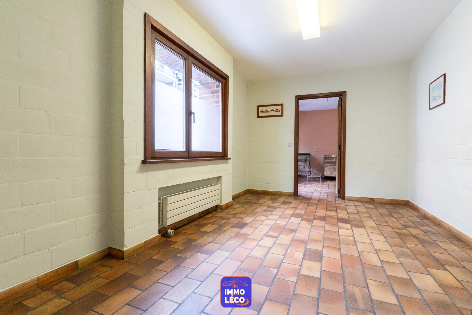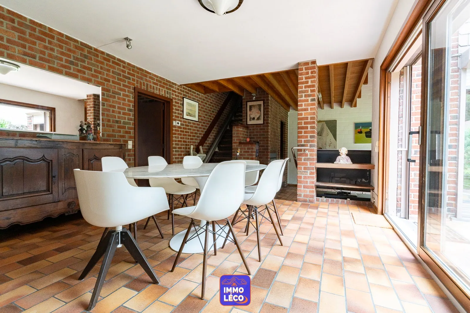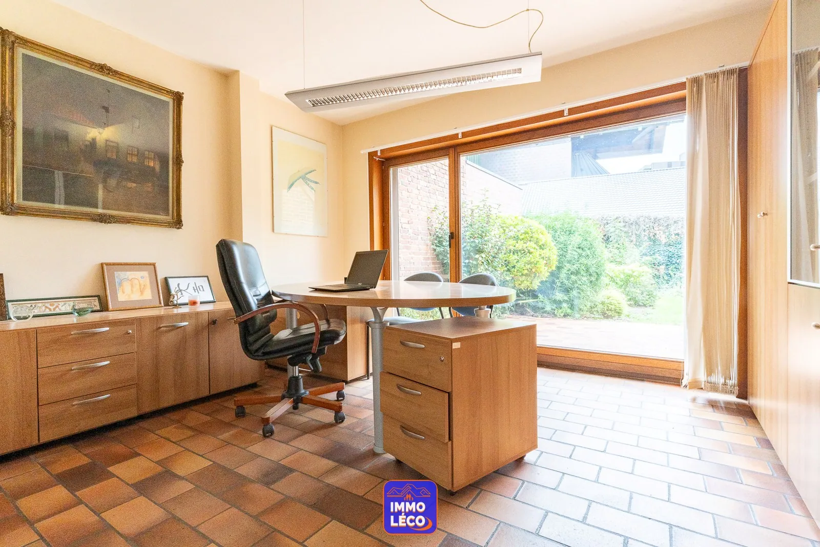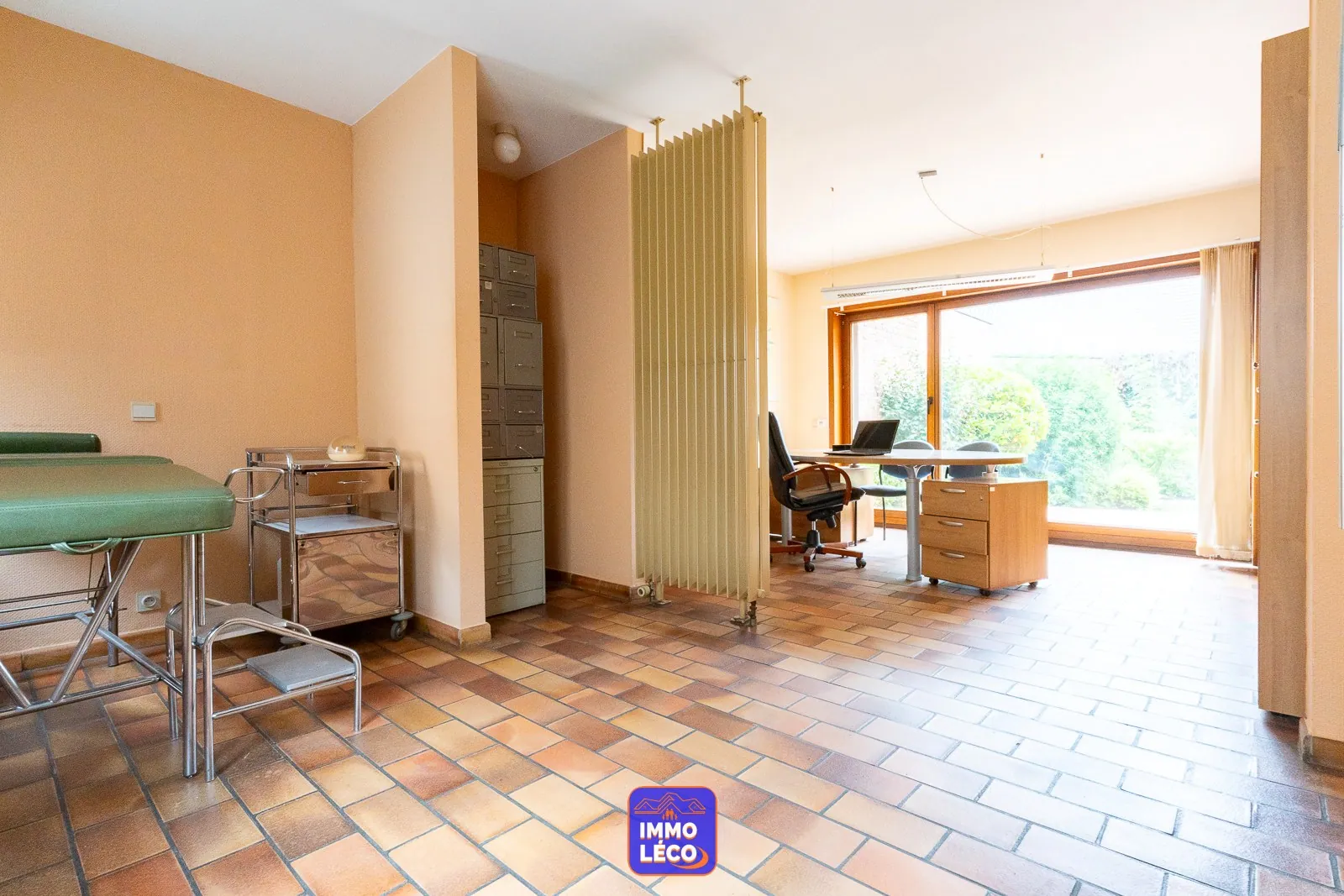 Au rez-de-chaussée : Spacieux hall d'entrée, WC, lavabo, vestiaire, accès direct à l'espace dédié à une profession libérale (grande salle d'attente, bureau) anciennement exploité en cabinet médial, modulable en fonction des besoins futurs. Accès direct à un double garage carrelé (porte sectionnelle motorisée). Spacieux séjour (salon en contrebas, salle à manger), cuisine attenante équipée avec coin repas (hotte, plaque de cuisson au gaz, double évier, four, lave-vaisselle, rangements), buanderie avec coin laverie, cave saine.