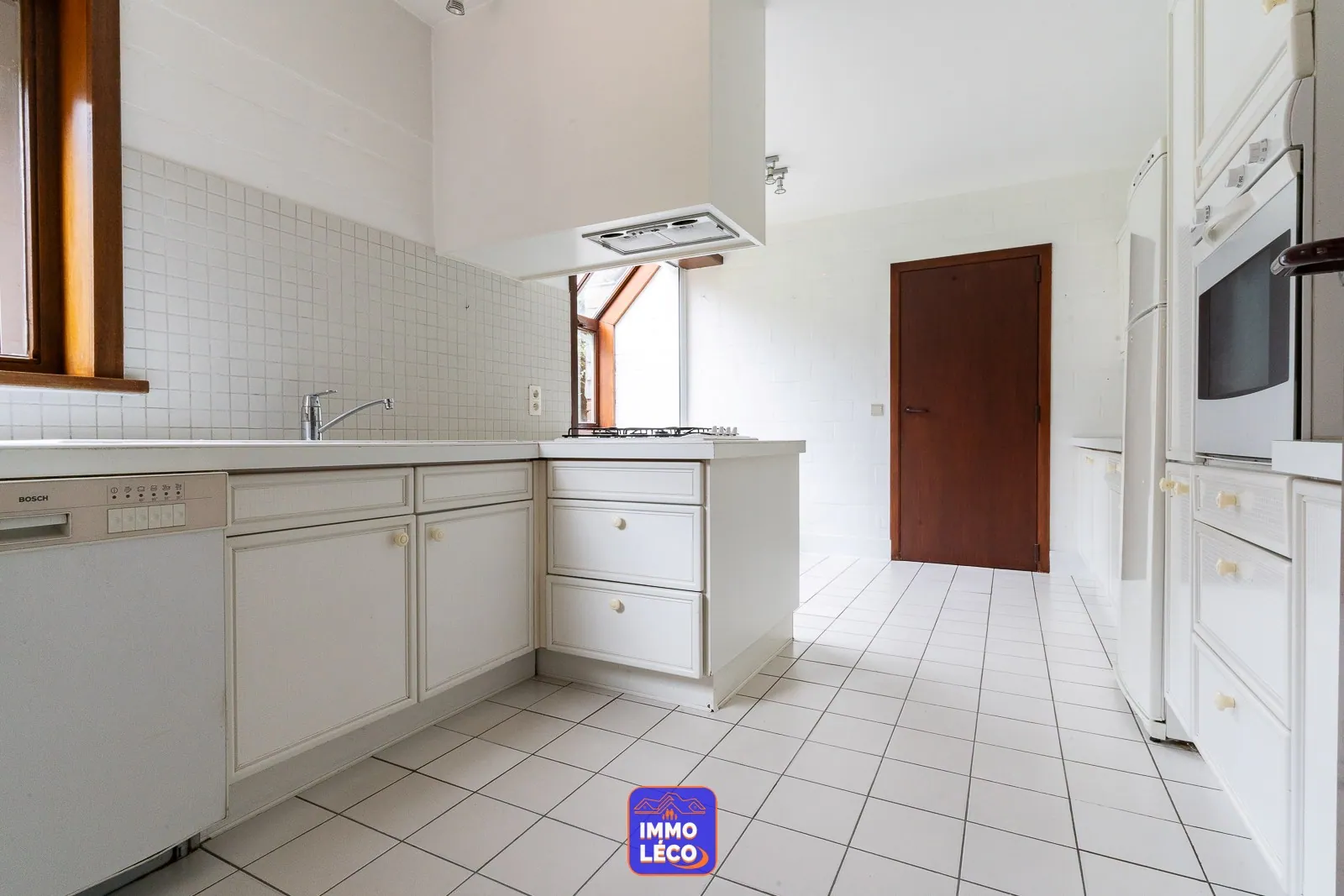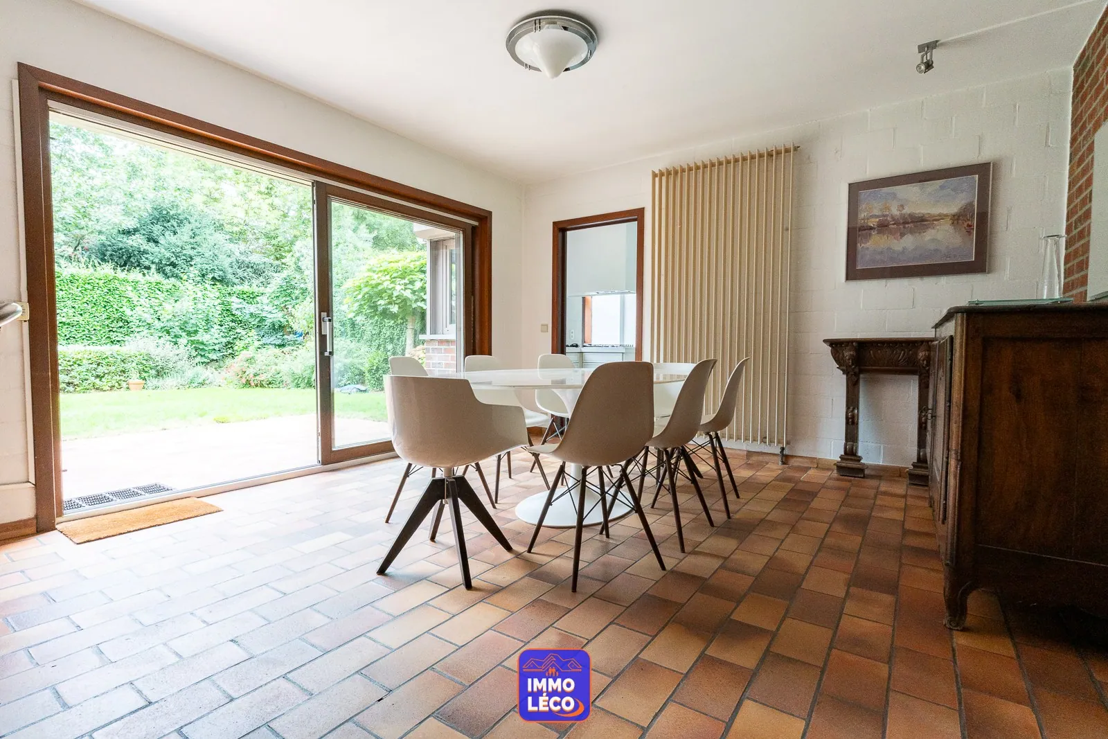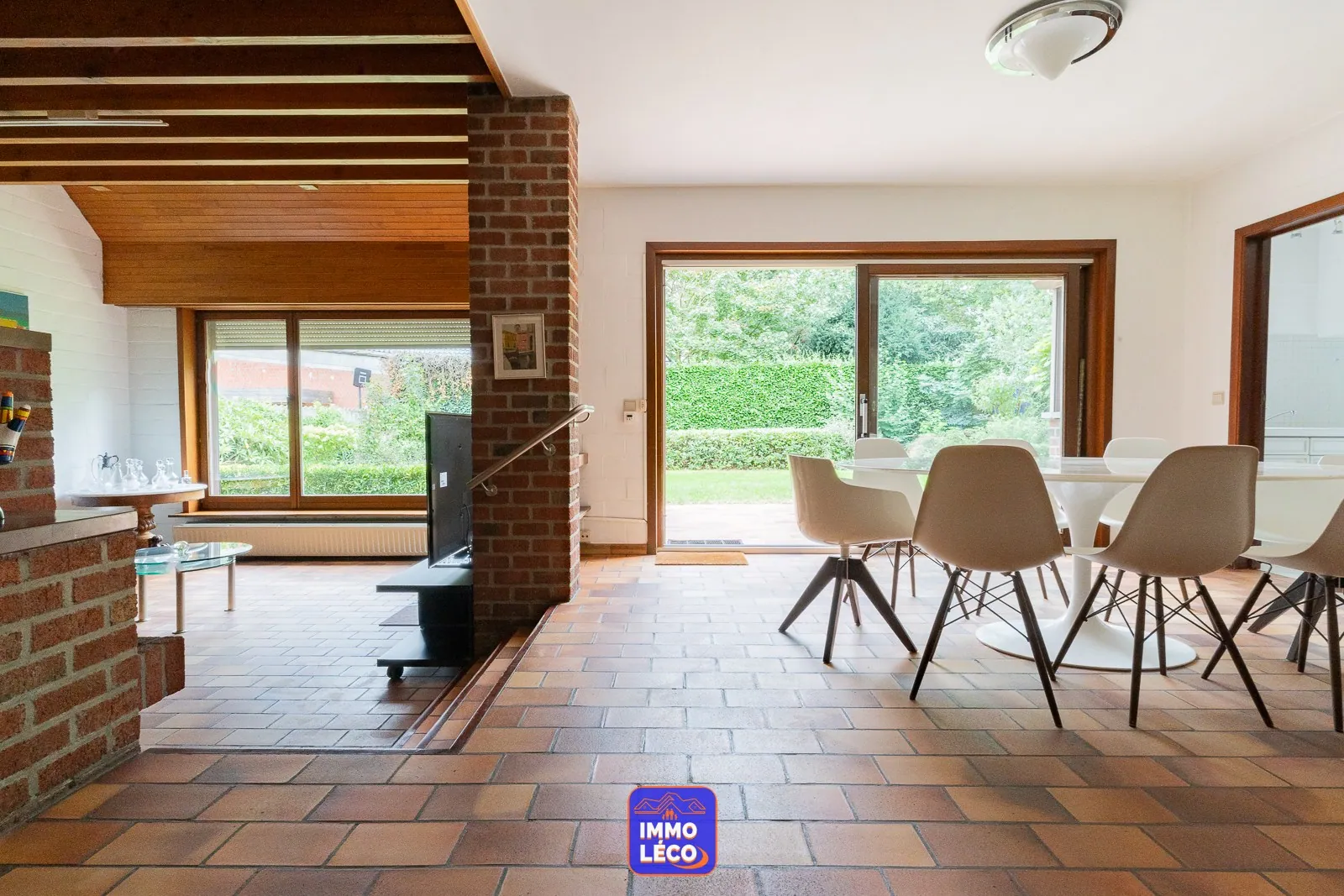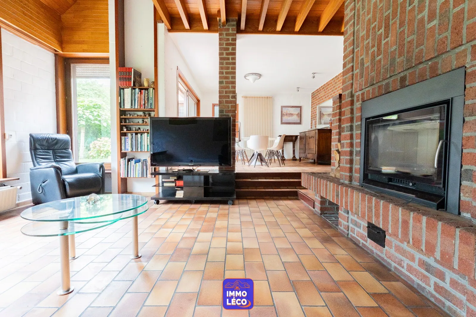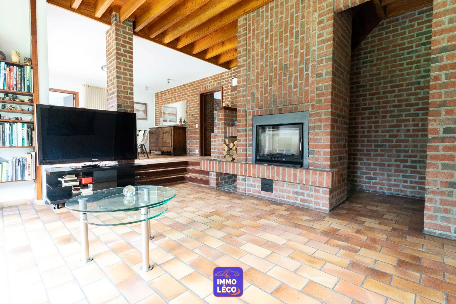 Au rez-de-chaussée : Spacieux hall d'entrée, WC, lavabo, vestiaire, accès direct à l'espace dédié à une profession libérale (grande salle d'attente, bureau) anciennement exploité en cabinet médial, modulable en fonction des besoins futurs. Accès direct à un double garage carrelé (porte sectionnelle motorisée). Spacieux séjour (salon en contrebas, salle à manger), cuisine attenante équipée avec coin repas (hotte, plaque de cuisson au gaz, double évier, four, lave-vaisselle, rangements), buanderie avec coin laverie, cave saine.