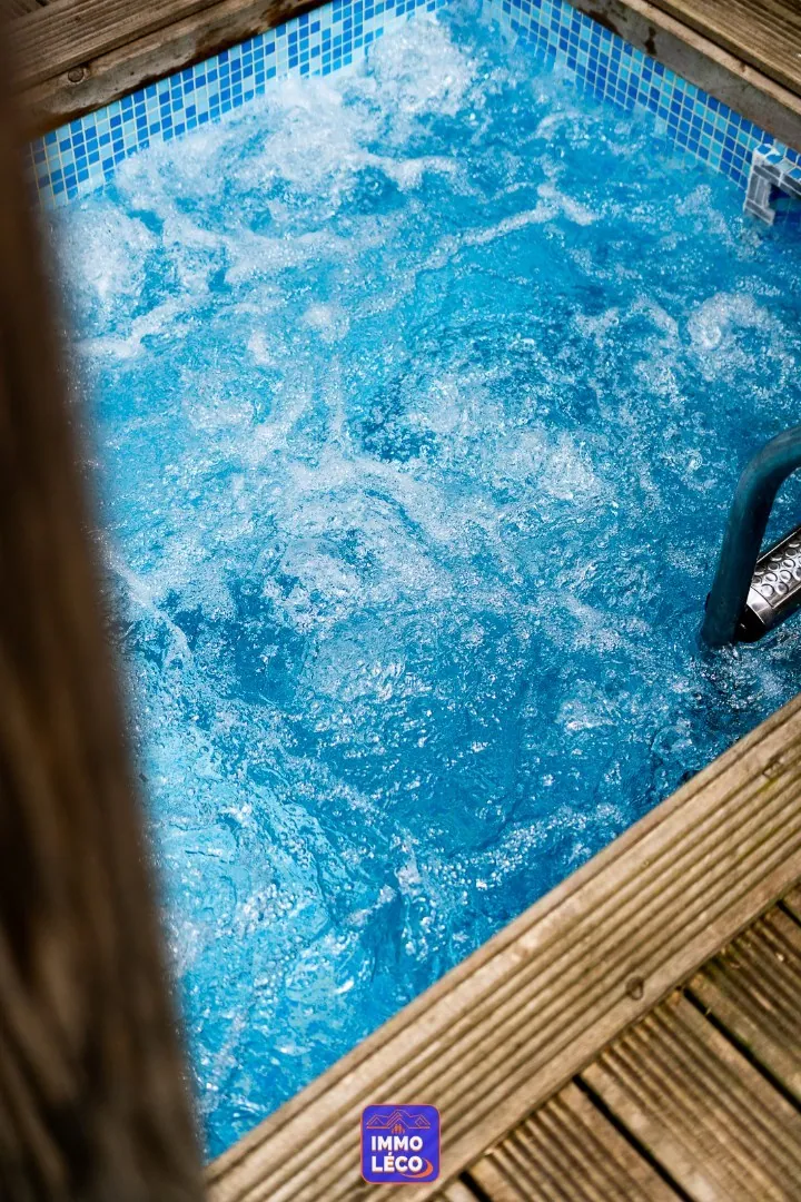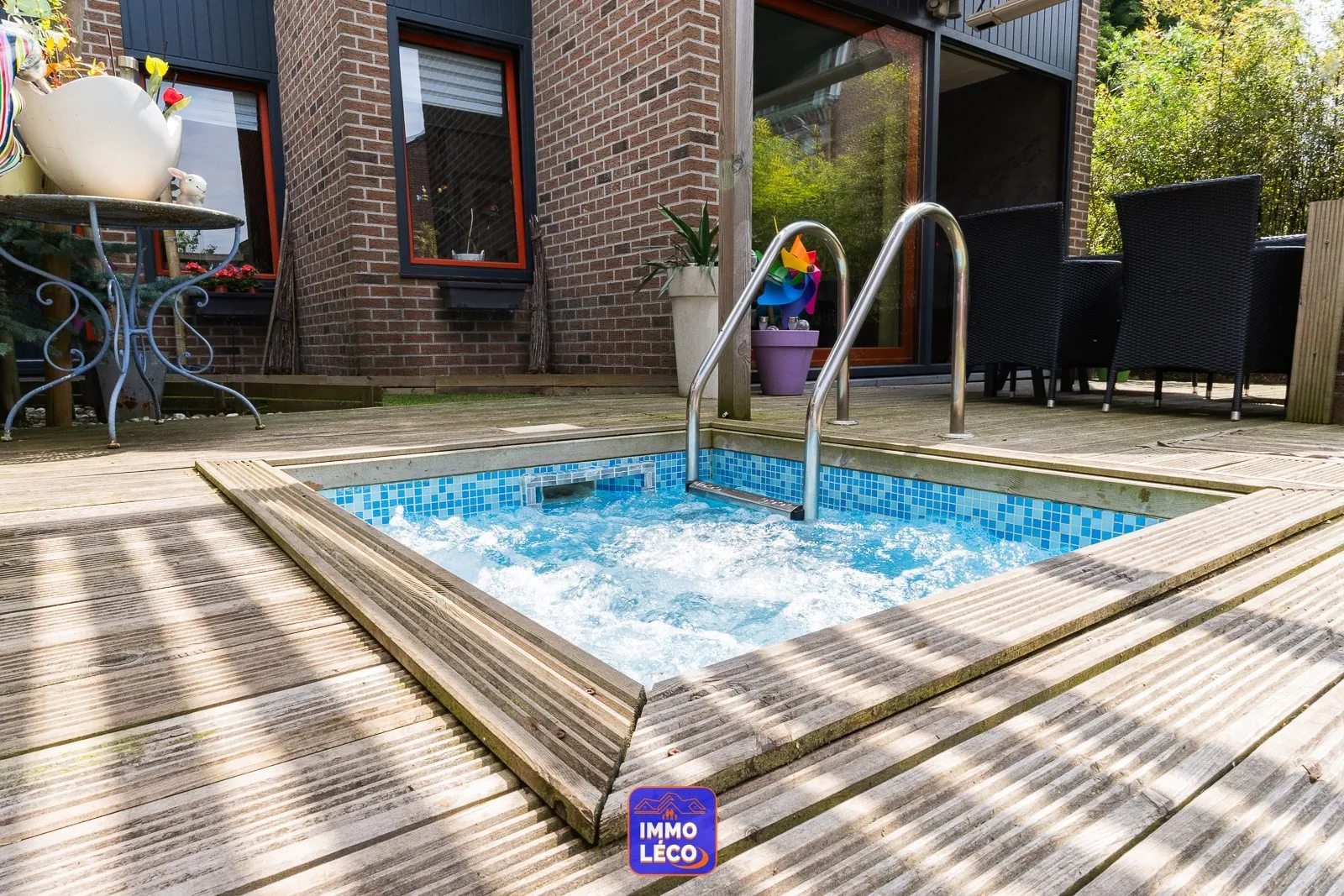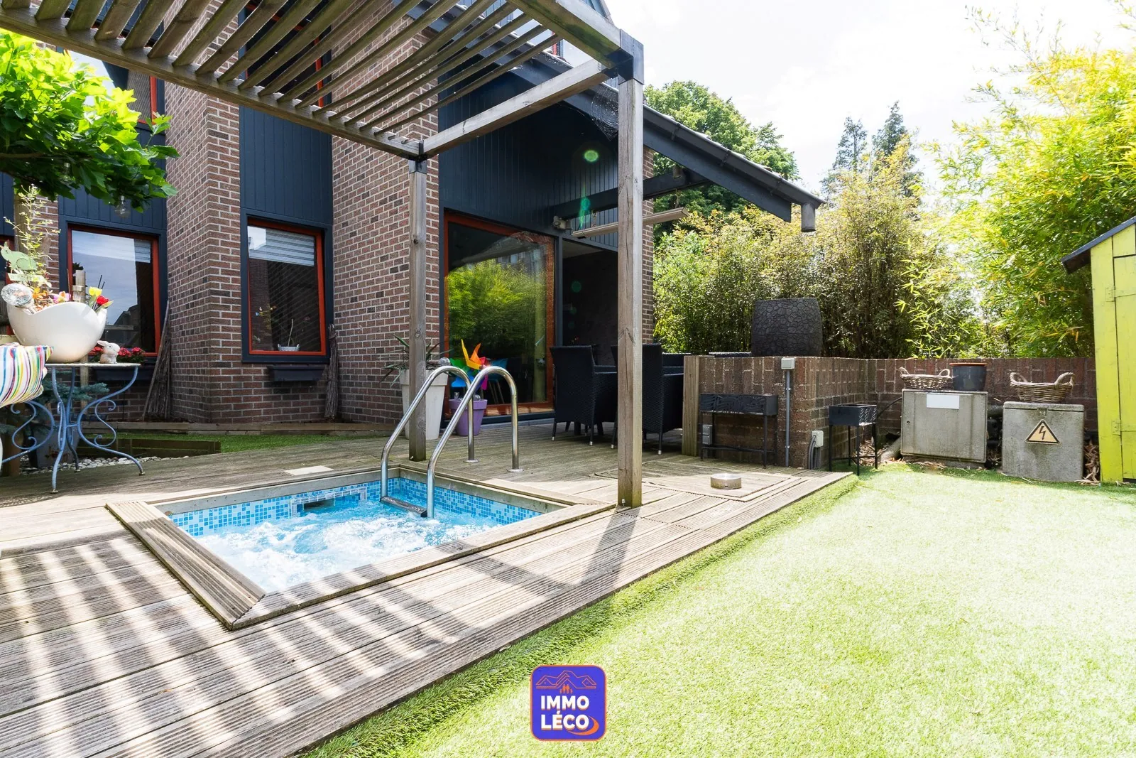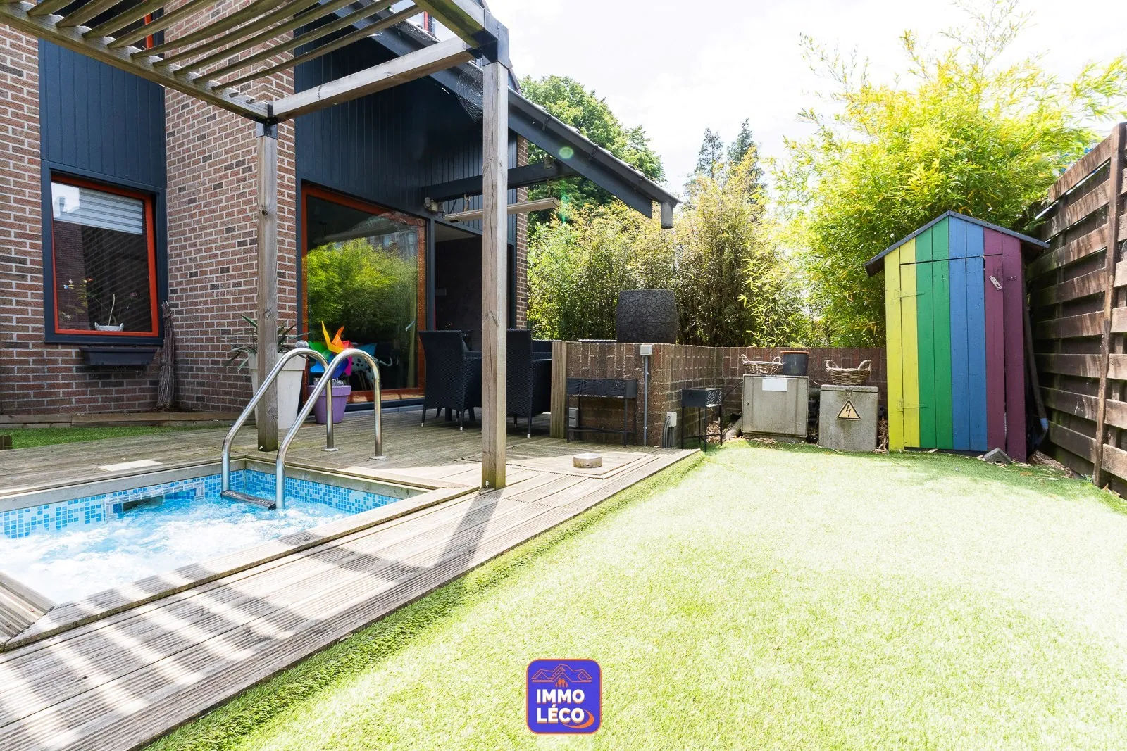Extérieur (parcelle totale de 183m²) : Jardin clôturé et arboré équipé d'une terrasse en bois, d'un étang et d'un jacuzzi.
