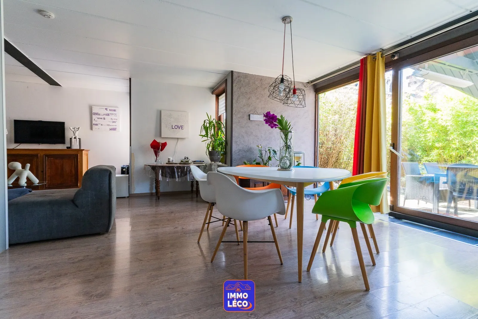 Au rez-de-chaussée : Hall d'entrée, WC, lave-mains, lumineux et spacieux séjour en "L" (salon, salle à manger), cuisine équipée ouverte (hotte,