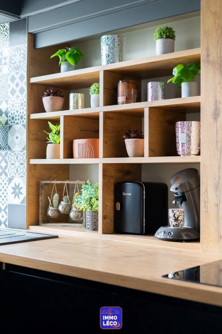 • Cuisine équipée ouverte avec coin repas : hotte, taque induction, évier, lave-vaisselle, frigo, nombreux rangements
