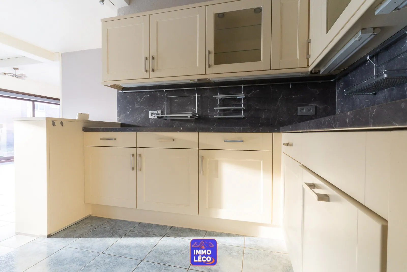 Au rez-de-chaussée : Spacieux hall d'entrée, bureau/remise, WC avec lave-mains, lumineux séjour (salon, salle à manger) équipé d'un feu cassette à bois, cuisine équipée ouverte (hotte, plaque de cuisson au gaz, four, micro-ondes, frigo, évier, nombreux rangements), véranda carrelée attenante au séjour, salle de bains,