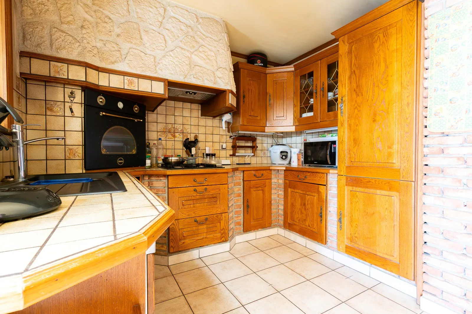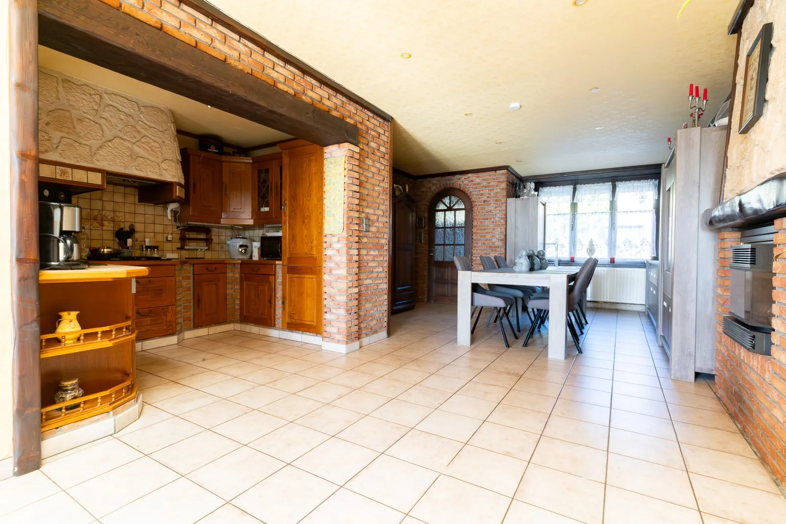 Au rez de chaussée : Hall d’entrée, spacieux séjour, cuisine en chêne équipée ouverte (hotte, plaque de cuisson au gaz, four, double évier, frigo, congélateur, nombreux rangements), lumineuse extension desservant un espace salon à l'arrière, une salle de bains faïencée composée d'une douche, d'un meuble lavabo et d'une
