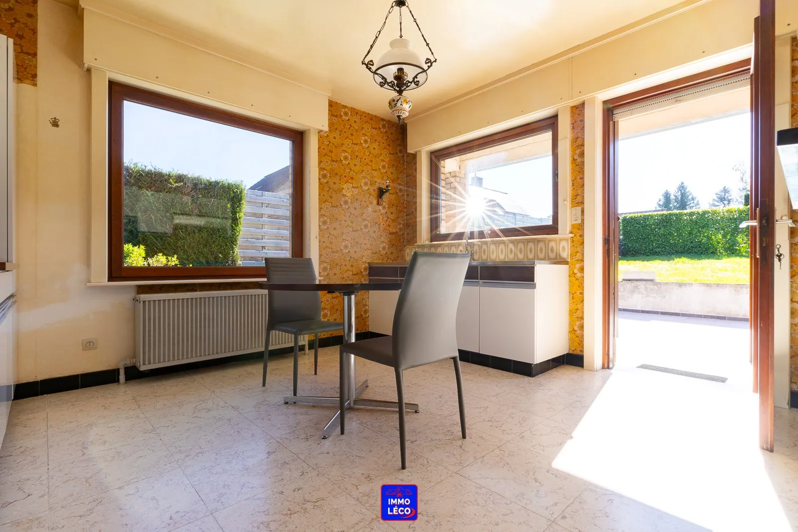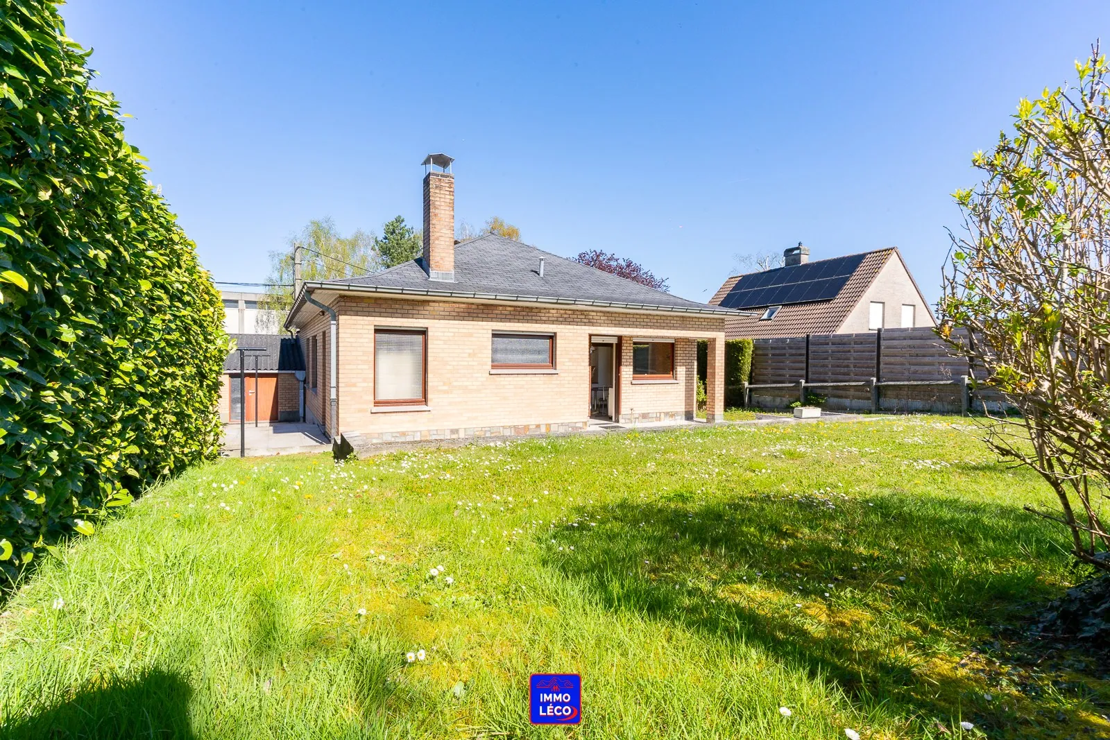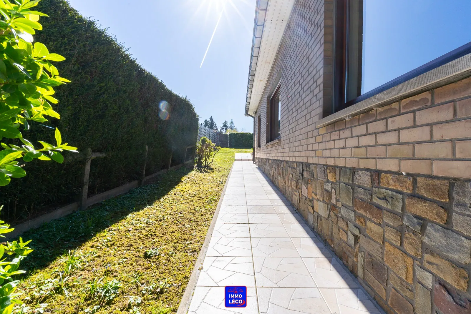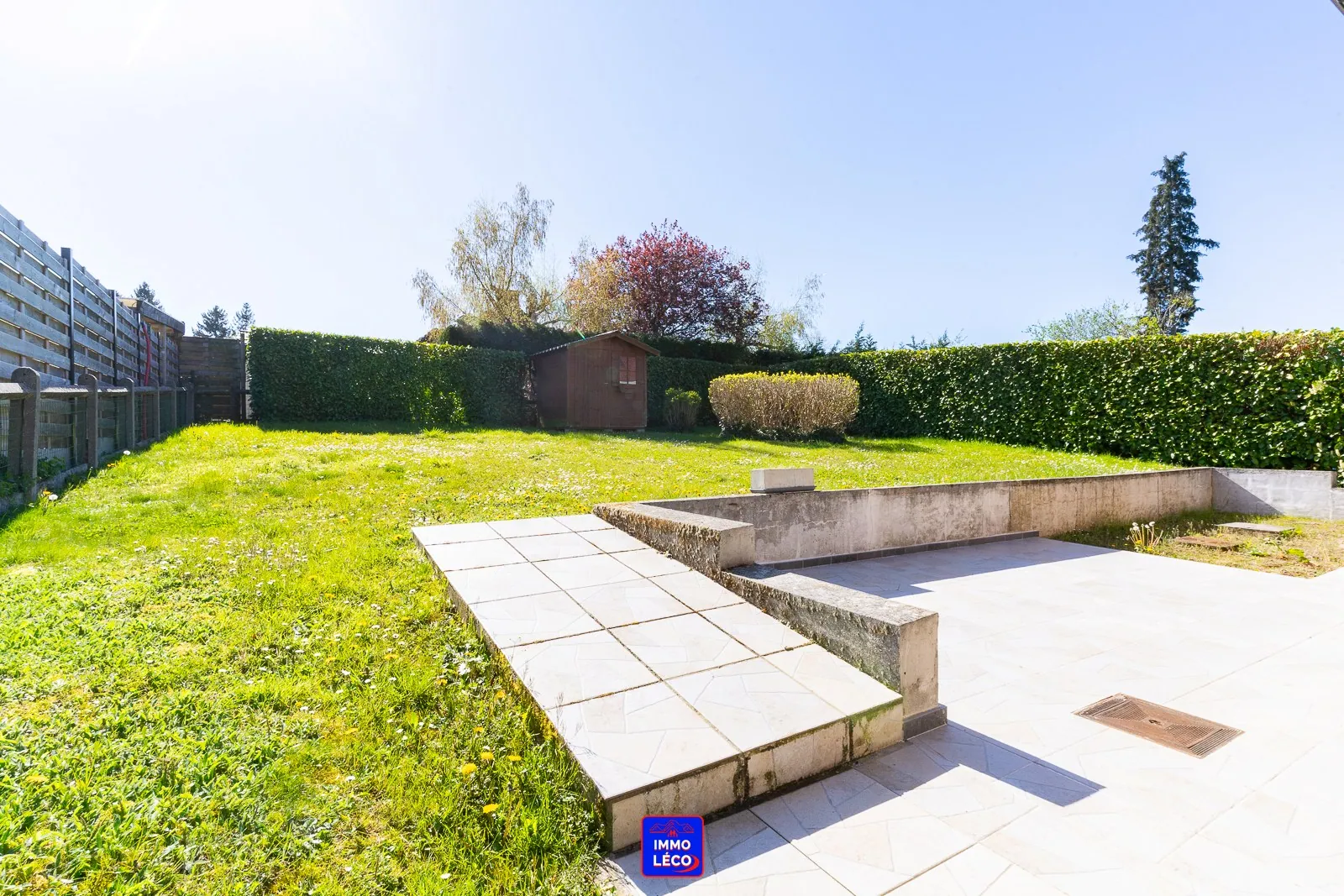 Extérieur : Garage carrelé de +/- 20m² avec espace de stockage sous la toiture, deux belles terrasses carrelées, passage latéral en façade offrant un accès direct à un jardin clôturé de +/- 260m² ayant une superbe exposition "SUD-EST", chalet en bois.