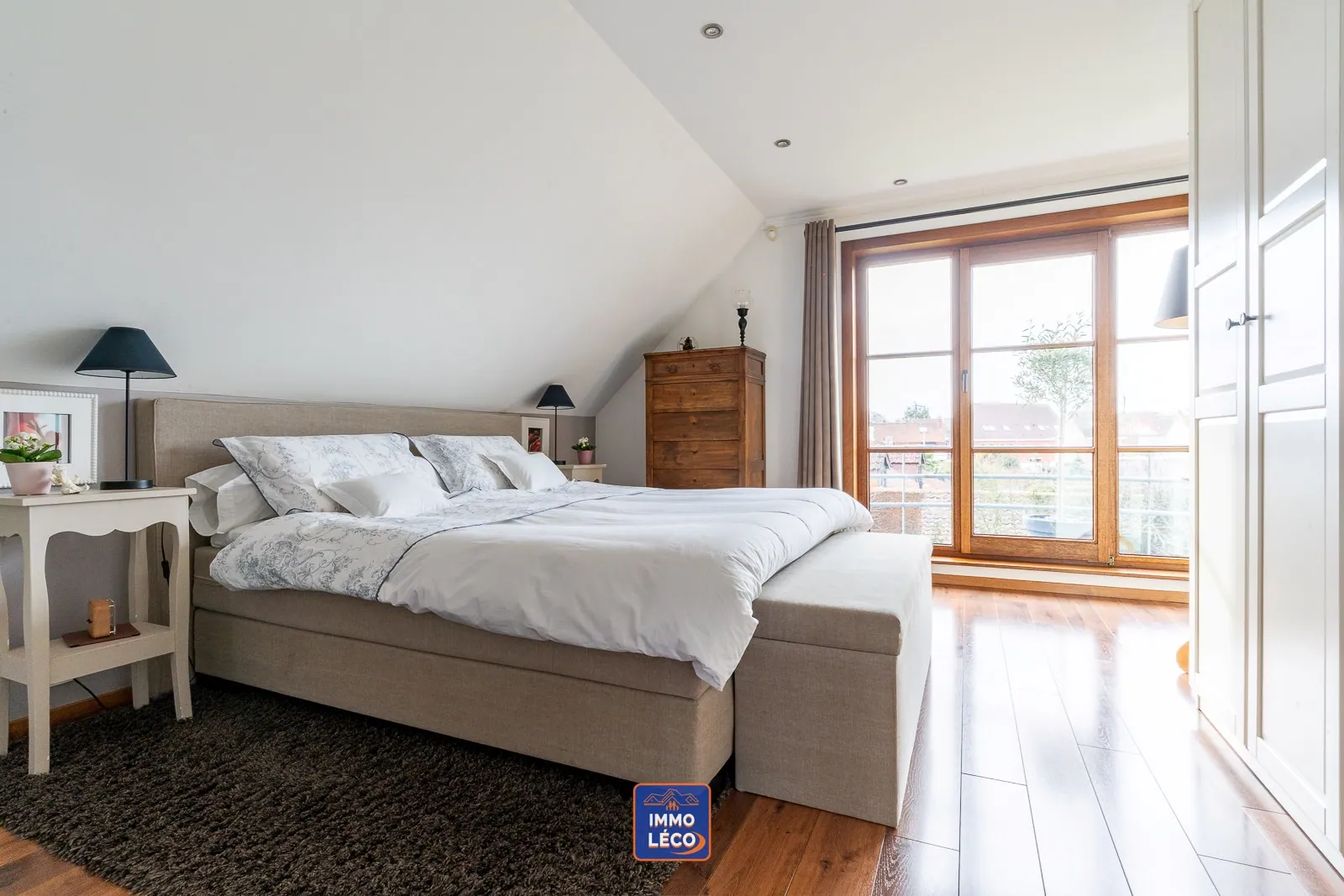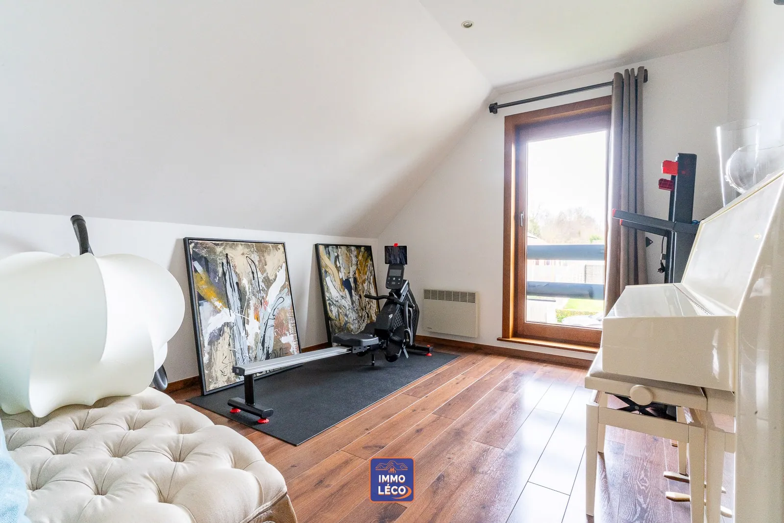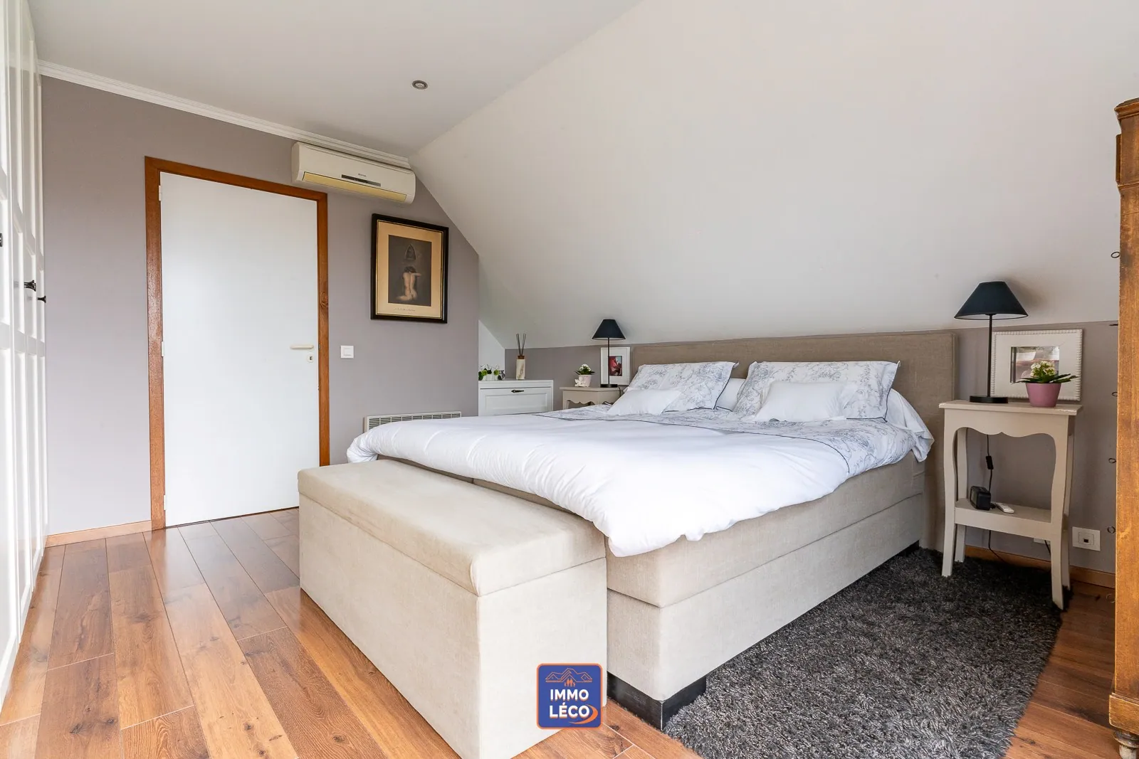 À l’étage, le hall de nuit dessert trois belles chambres d’environ 15 m² dont une superbe suite parentale avec dressing. Une salle de bain élégante et une salle de douche supplémentaire assurent un confort optimal pour toute la famille.