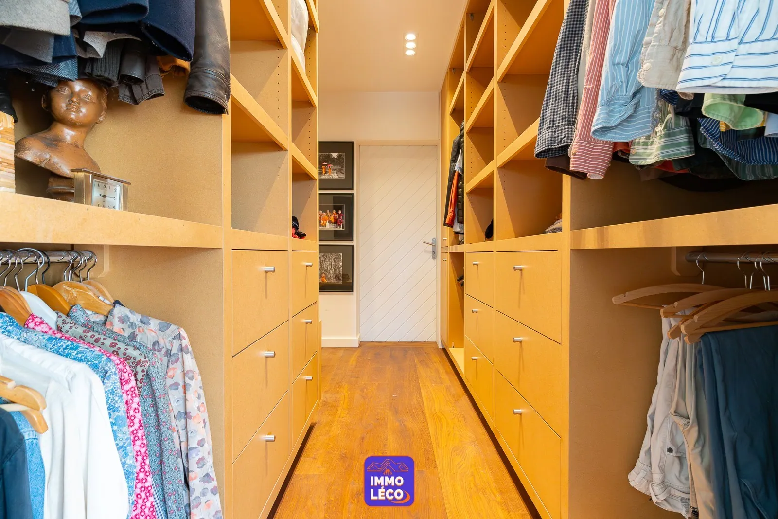 et cheminée à bois. Les meubles sur mesure apportent une touche d’élégance supplémentaire.