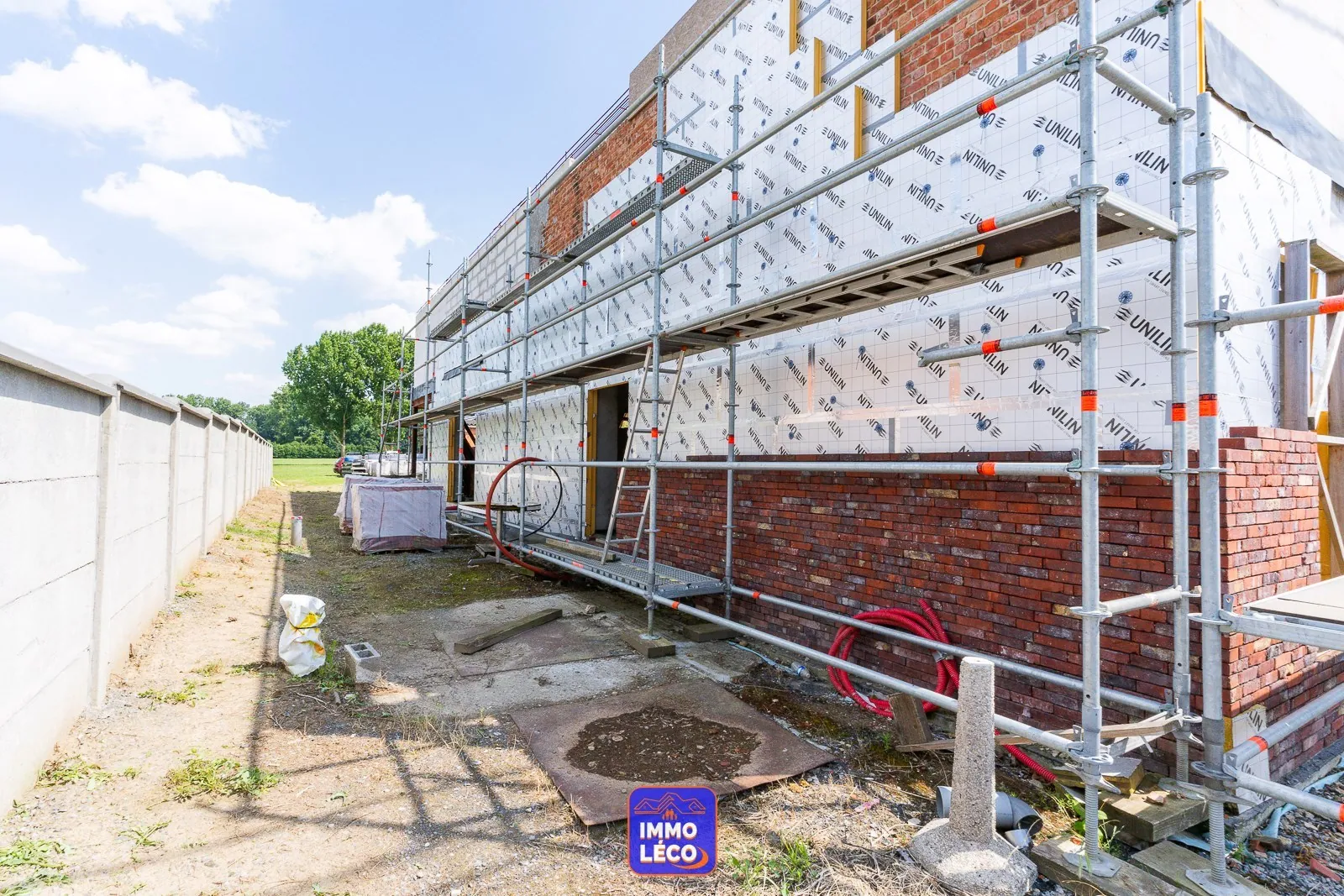 Au rez-de-chaussée, on retrouve un hall d'entrée, un spacieux bureau en façade de +/- 22m², un WC, un vaste séjour ouvert avec escalier apparent (salon, salle à manger) ainsi qu'une cuisine ouverte. Un garage de 45m² ainsi qu'un cellier viennent clôturer le rez-de-chaussée.