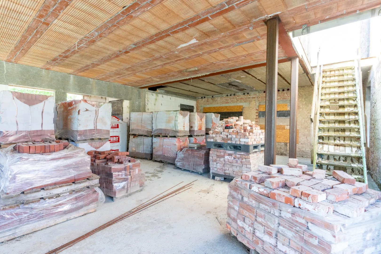Au rez-de-chaussée, on retrouve un hall d'entrée, un spacieux bureau en façade de +/- 22m², un WC, un vaste séjour ouvert avec escalier apparent (salon, salle à manger) ainsi qu'une cuisine ouverte. Un garage de 45m² ainsi qu'un cellier viennent clôturer le rez-de-chaussée.